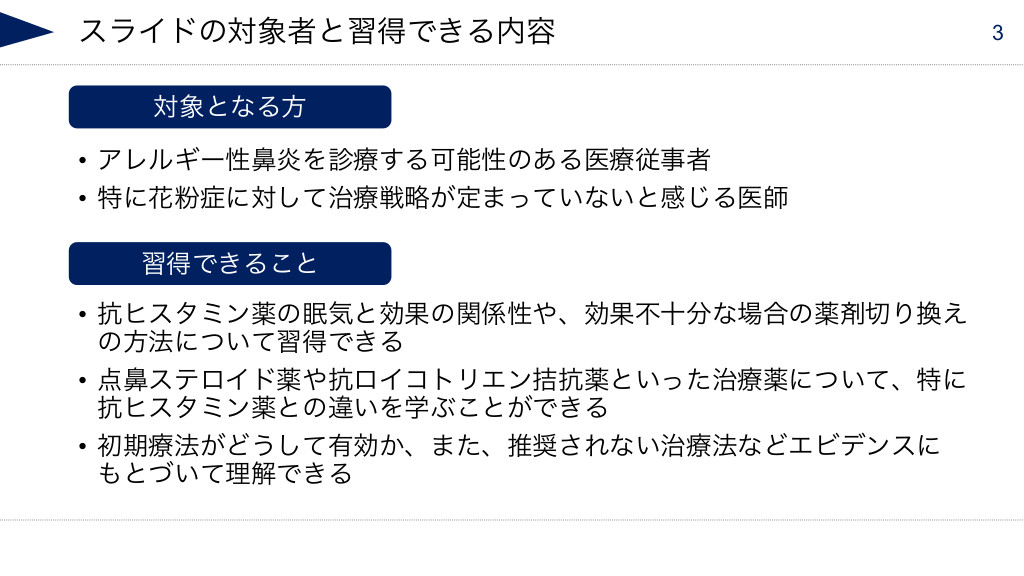 #3. スライドの対象者と習得できる内容 対象となる方 • アレルギー性鼻炎を診療する可能性のある医療従事者 • 特に花粉症に対して治療戦略が定まっていないと感じる医師 習得できること • 抗ヒスタミン薬の眠気と効果の関係性や、効果不十分な場合の薬剤切り換え の方法について習得できる • 点鼻ステロイド薬や抗ロイコトリエン拮抗薬といった治療薬について、特に 抗ヒスタミン薬との違いを学ぶことができる • 初期療法がどうして有効か、また、推奨されない治療法などエビデンスに もとづいて理解できる 3
