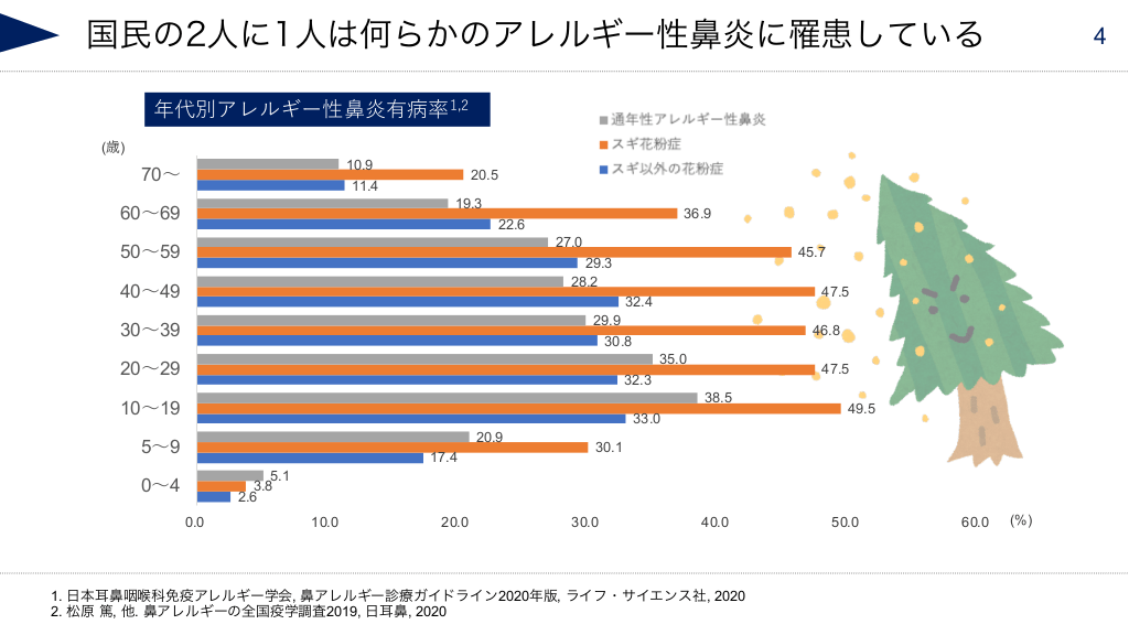 #4. 国民の2人に1人は何らかのアレルギー性鼻炎に罹患している 4 年代別アレルギー性⿐炎有病率1,2 (歳) 10.9 11.4 70〜 20.5 19.3 60〜69 36.9 22.6 27.0 50〜59 45.7 29.3 28.2 40〜49 47.5 32.4 29.9 30.8 30〜39 46.8 35.0 20〜29 47.5 32.3 38.5 10〜19 33.0 20.9 5〜9 17.4 49.5 30.1 5.1 3.8 2.6 0〜4 0.0 10.0 20.0 30.0 40.0 1. 日本耳鼻咽喉科免疫アレルギー学会, 鼻アレルギー診療ガイドライン2020年版, ライフ・サイエンス社, 2020 2. 松原 篤, 他. 鼻アレルギーの全国疫学調査2019, 日耳鼻, 2020 50.0 60.0 (%)