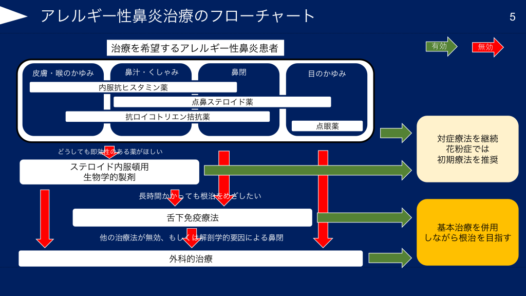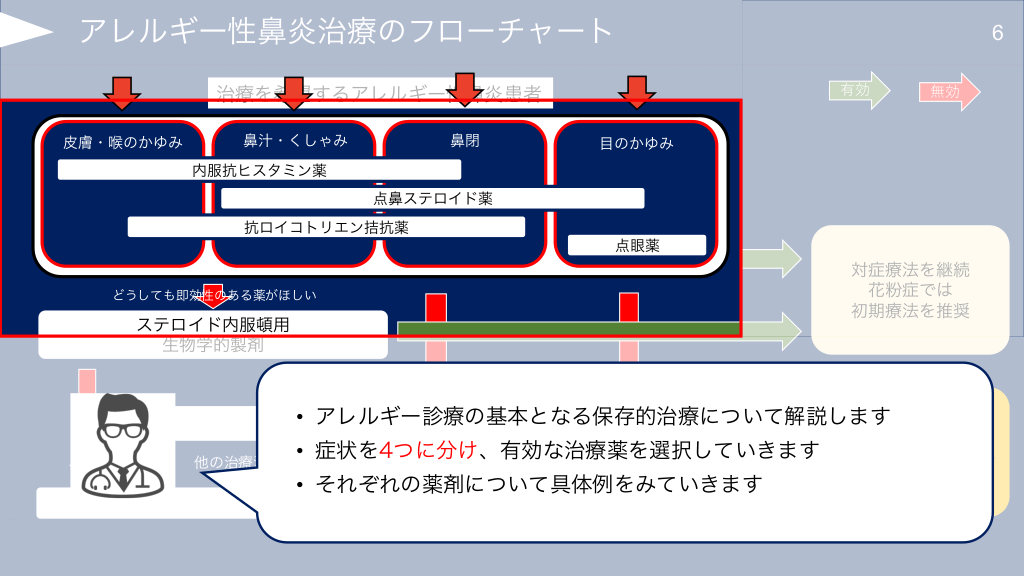 #5. アレルギー性鼻炎治療のフローチャート 治療を希望するアレルギー性鼻炎患者 皮膚・喉のかゆみ 鼻汁・くしゃみ 鼻閉 5 有効 無効 目のかゆみ 内服抗ヒスタミン薬 点鼻ステロイド薬 抗ロイコトリエン拮抗薬 どうしても即効性のある薬がほしい ステロイド内服頓用 生物学的製剤 点眼薬 対症療法を継続 花粉症では 初期療法を推奨 長時間かかっても根治をめざしたい 舌下免疫療法 他の治療法が無効、もしくは解剖学的要因による鼻閉 外科的治療 基本治療を併用 しながら根治を目指す