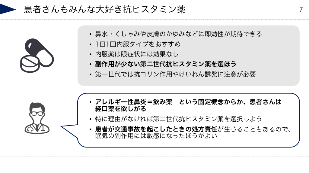 #7. 患者さんもみんな大好き抗ヒスタミン薬 • 鼻水・くしゃみや皮膚のかゆみなどに即効性が期待できる • 1日1回内服タイプをおすすめ • 内服薬は眼症状には効果なし • 副作用が少ない第二世代抗ヒスタミン薬を選ぼう • 第一世代では抗コリン作用やけいれん誘発に注意が必要 • アレルギー性鼻炎=飲み薬 という固定概念からか、患者さんは 経口薬を欲しがる • 特に理由がなければ第二世代抗ヒスタミン薬を選択しよう • 患者が交通事故を起こしたときの処方責任が生じることもあるので、 眠気の副作用には敏感になったほうがよい 7