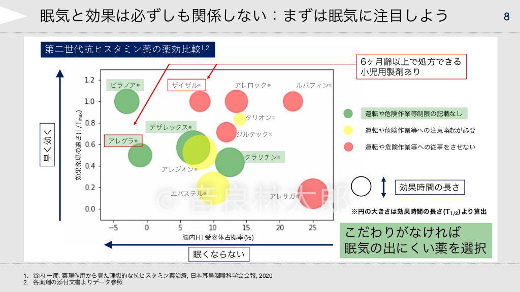 #8. 眠気と効果は必ずしも関係しない:まずは眠気に注目しよう 第⼆世代抗ヒスタミン薬の薬効⽐較1,2 効果発現の速さ(1/Tmax) 早く効く ビラノア® ザイザル® 6ヶ月齢以上で処方できる 小児用製剤あり アレロック® ルパフィン® タリオン® デザレックス® ジルテック® アレグラ® クラリチン® 運転や危険作業等制限の記載なし 運転や危険作業等への注意喚起が必要 運転や危険作業等への従事をさせない アレジオン® エバステル® アレサガ® 効果時間の長さ ※円の大きさは効果時間の長さ(T1/2)より算出 脳内H1受容体占拠率(%) 眠くならない 1. 谷内 一彦. 薬理作用から見た理想的な抗ヒスタミン薬治療, 日本耳鼻咽喉科学会会報, 2020 2. 各薬剤の添付文書よりデータ参照 こだわりがなければ 眠気の出にくい薬を選択 8