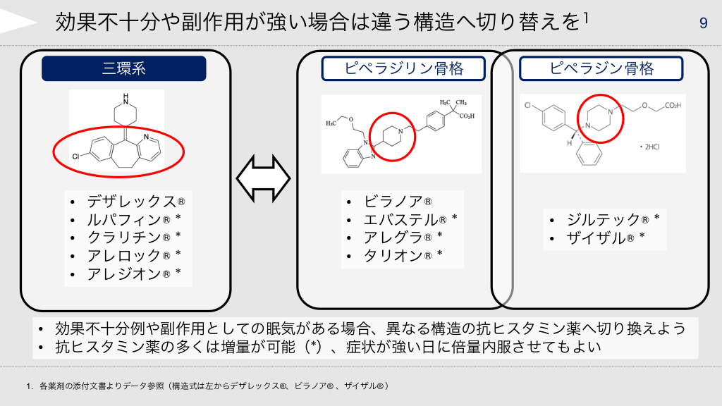 #9. 効果不十分や副作用が強い場合は違う構造へ切り替えを1 三環系 • • • • • デザレックス® ルパフィン® * クラリチン® * アレロック® * アレジオン® * ピペラジリン骨格 • • • • ビラノア® エバステル® * アレグラ® * タリオン® * ピペラジン骨格 • ジルテック® * • ザイザル® * • 効果不十分例や副作用としての眠気がある場合、異なる構造の抗ヒスタミン薬へ切り換えよう • 抗ヒスタミン薬の多くは増量が可能(*)、症状が強い日に倍量内服させてもよい 1. 各薬剤の添付文書よりデータ参照(構造式は左からデザレックス®、ビラノア® 、ザイザル® ) 9