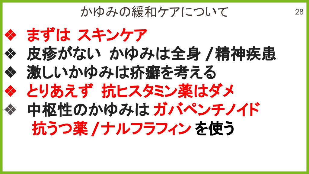 #23. かゆみ ❖ ❖ ❖ ❖ ❖ 緩和ケアについて まず スキンケア 皮疹がない かゆみ 全身 /精神疾患 激しいかゆみ 疥癬を考える とりあえず 抗ヒスタミン薬 ダメ 中枢性 かゆみ ガバペンチノイド 抗うつ薬 /ナルフラフィン を使う 28