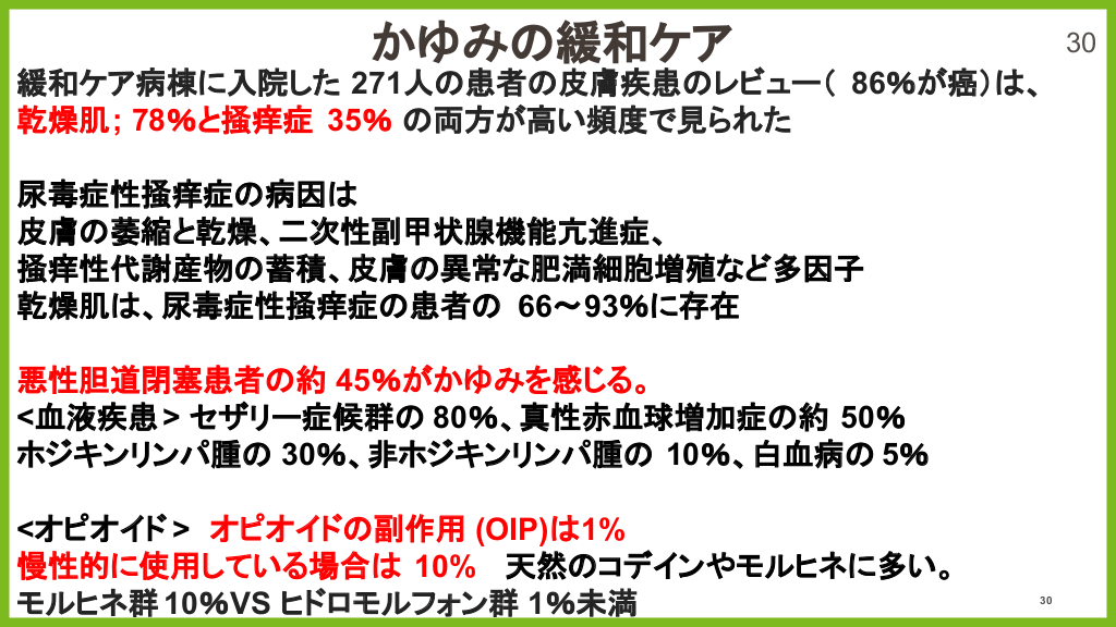 #25. かゆみ 緩和ケア 緩和ケア病棟に入院した 271人 患者 皮膚疾患 レビュー( 86%が癌) 乾燥肌; 78%と掻痒症 35% 両方が高い頻度で見られた 30 、 尿毒症性掻痒症 病因 皮膚 萎縮と乾燥、二次性副甲状腺機能亢進症、 掻痒性代謝産物 蓄積、皮膚 異常な肥満細胞増殖など多因子 乾燥肌 、尿毒症性掻痒症 患者 66〜93%に存在 悪性胆道閉塞患者 約 45%がかゆみを感じる。 <血液疾患 > セザリー症候群 80%、真性赤血球増加症 約 50% ホジキンリンパ腫 30%、非ホジキンリンパ腫 10%、白血病 5% <オピオイド > オピオイド 副作用 (OIP) 1% 慢性的に使用している場合 10% 天然 コデインやモルヒネに多い。 モルヒネ群 10%VS ヒドロモルフォン群 1%未満 30