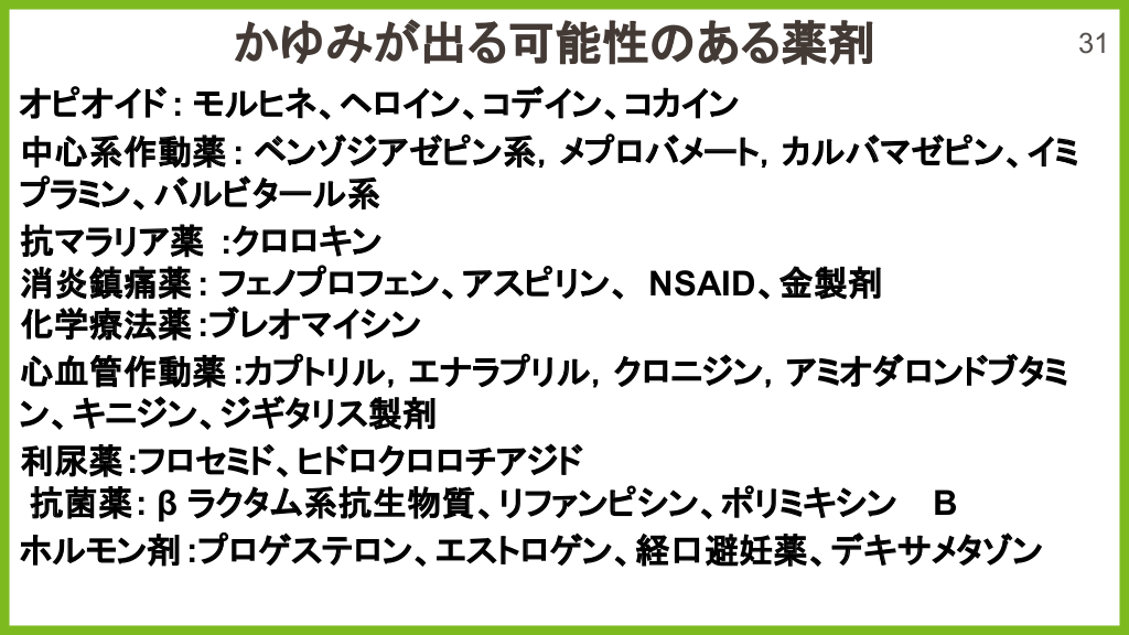 #26. かゆみが出る可能性 ある薬剤 31 オピオイド : モルヒネ、ヘロイン、コデイン、コカイン 中心系作動薬 : ベンゾジアゼピン系,メプロバメート,カルバマゼピン、イミ プラミン、バルビタール系 抗マラリア薬 :クロロキン 消炎鎮痛薬 : フェノプロフェン、アスピリン、 NSAID、金製剤 化学療法薬 :ブレオマイシン 心血管作動薬 :カプトリル,エナラプリル,クロニジン,アミオダロンドブタミ ン、キニジン、ジギタリス製剤 利尿薬:フロセミド、ヒドロクロロチアジド 抗菌薬: β ラクタム系抗生物質、リファンピシン、ポリミキシン B ホルモン剤 :プロゲステロン、エストロゲン、経口避妊薬、デキサメタゾン