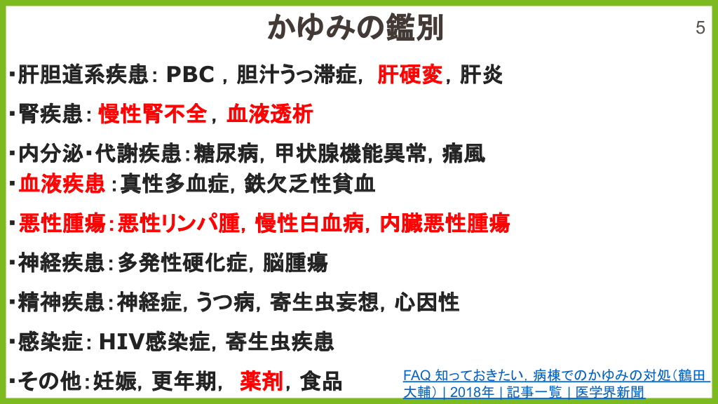 #5. かゆみ 鑑別 5 ・肝胆道系疾患: PBC ,胆汁うっ滞症, 肝硬変,肝炎 ・腎疾患: 慢性腎不全 ,血液透析 ・内分泌・代謝疾患:糖尿病,甲状腺機能異常,痛風 ・血液疾患 :真性多血症,鉄欠乏性貧血 ・悪性腫瘍:悪性リンパ腫,慢性白血病,内臓悪性腫瘍 ・神経疾患:多発性硬化症,脳腫瘍 ・精神疾患:神経症,うつ病,寄生虫妄想,心因性 ・感染症: HIV感染症,寄生虫疾患 ・そ 他:妊娠,更年期, 薬剤,食品 FAQ 知っておきたい,病棟で かゆみ 対処(鶴田 大輔) | 2018年 | 記事一覧 | 医学界新聞