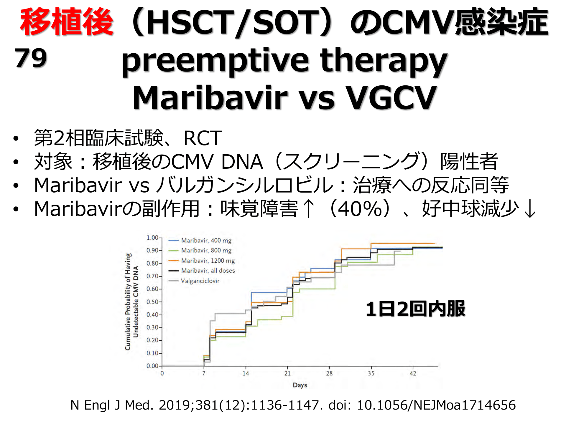 #100. 移植後(HSCT/SOT)のCMV感染症 79 preemptive therapy Maribavir vs VGCV • • • • 第2相臨床試験、RCT 対象:移植後のCMV DNA(スクリーニング)陽性者 Maribavir vs バルガンシルロビル:治療への反応同等 Maribavirの副作用:味覚障害↑(40%)、好中球減少↓ 1日2回内服 N Engl J Med. 2019;381(12):1136-1147. doi: 10.1056/NEJMoa1714656
