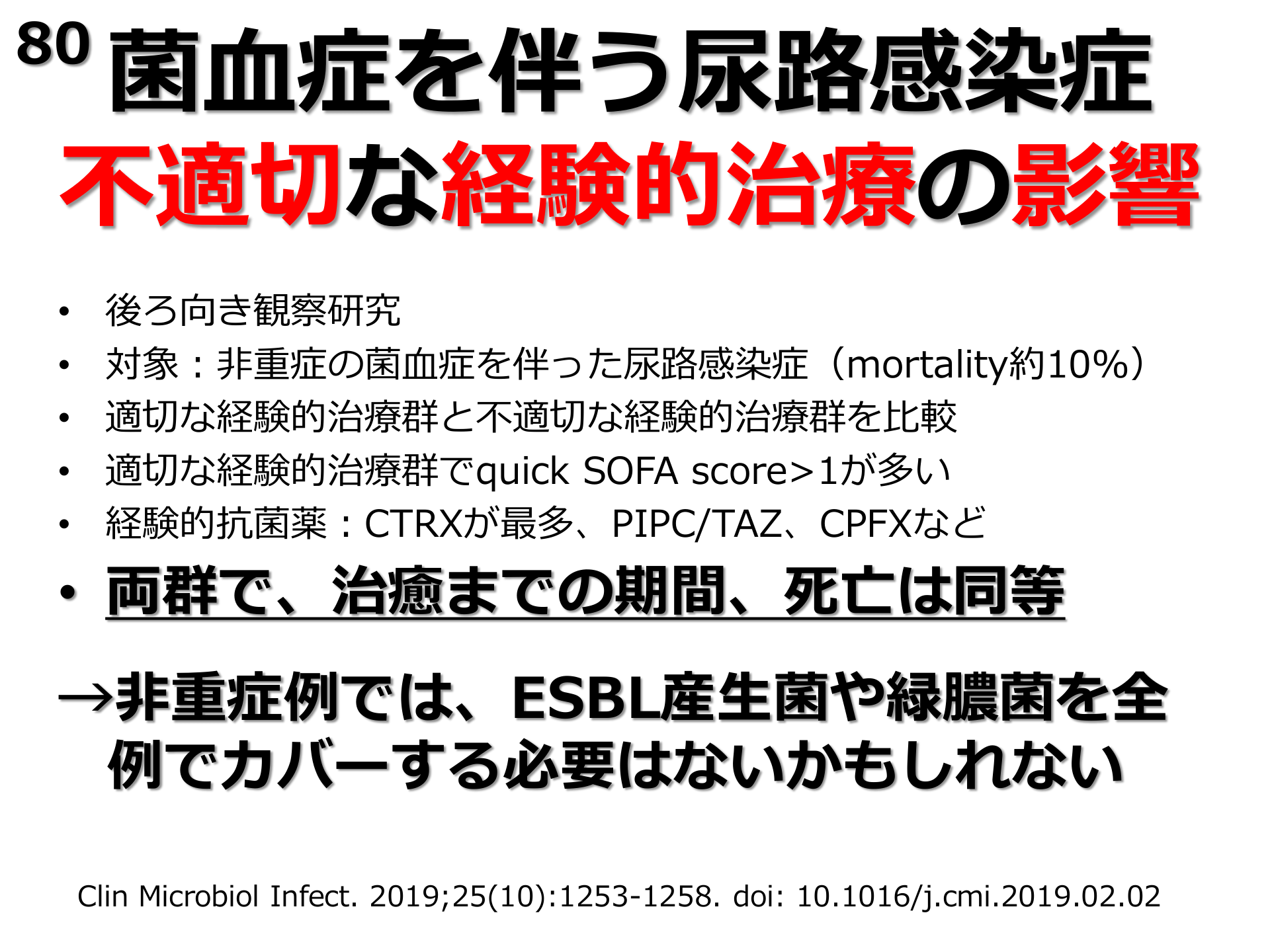 #101. 80 菌血症を伴う尿路感染症 不適切な経験的治療の影響 • • • • • 後ろ向き観察研究 対象:非重症の菌血症を伴った尿路感染症(mortality約10%) 適切な経験的治療群と不適切な経験的治療群を比較 適切な経験的治療群でquick SOFA score>1が多い 経験的抗菌薬:CTRXが最多、PIPC/TAZ、CPFXなど • 両群で、治癒までの期間、死亡は同等 →非重症例では、ESBL産生菌や緑膿菌を全 例でカバーする必要はないかもしれない Clin Microbiol Infect. 2019;25(10):1253-1258. doi: 10.1016/j.cmi.2019.02.02