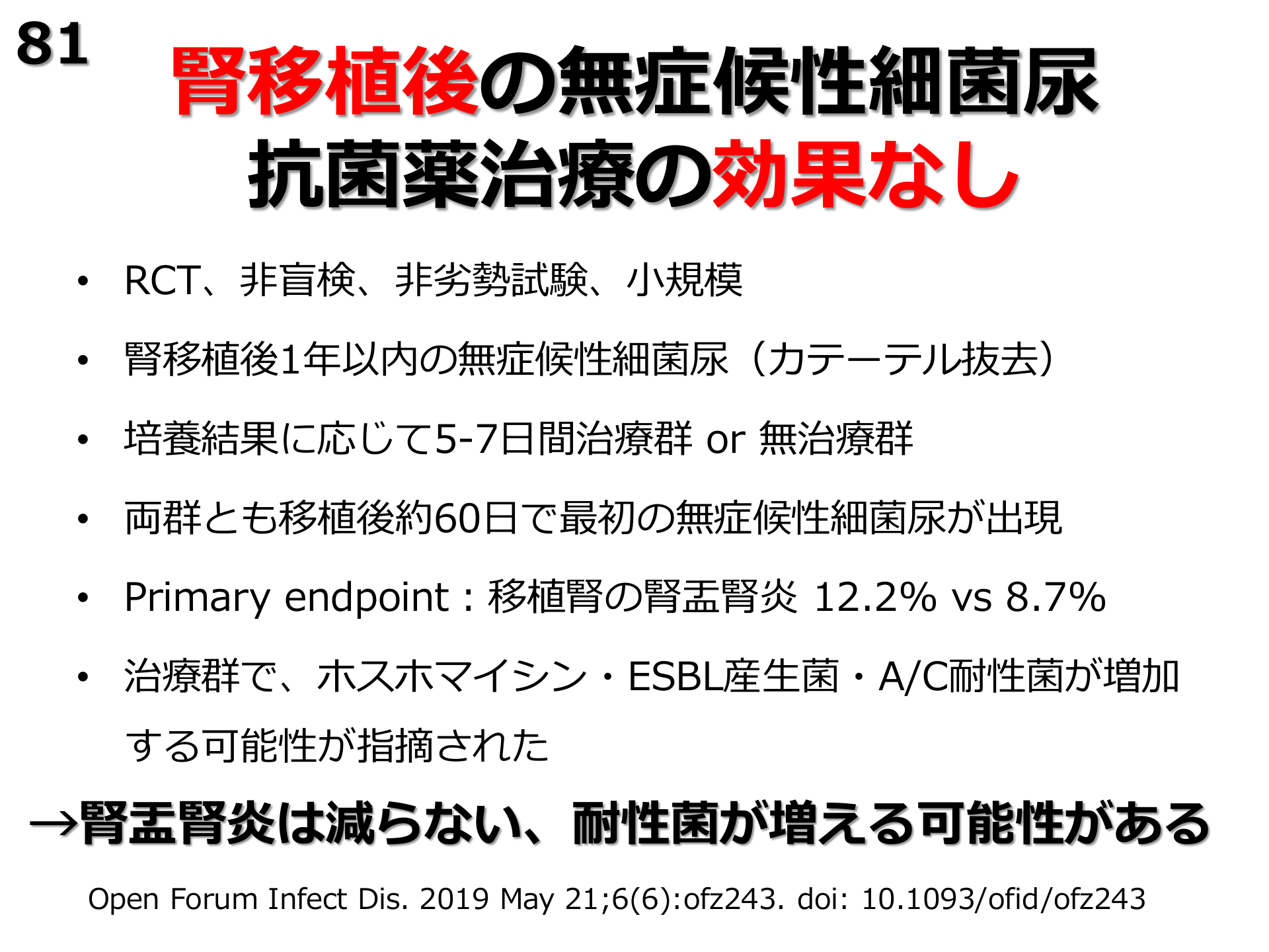 #102. 81 腎移植後の無症候性細菌尿 抗菌薬治療の効果なし • RCT、非盲検、非劣勢試験、小規模 • 腎移植後1年以内の無症候性細菌尿(カテーテル抜去) • 培養結果に応じて5-7日間治療群 or 無治療群 • 両群とも移植後約60日で最初の無症候性細菌尿が出現 • Primary endpoint:移植腎の腎盂腎炎 12.2% vs 8.7% • 治療群で、ホスホマイシン・ESBL産生菌・A/C耐性菌が増加 する可能性が指摘された →腎盂腎炎は減らない、耐性菌が増える可能性がある Open Forum Infect Dis. 2019 May 21;6(6):ofz243. doi: 10.1093/ofid/ofz243