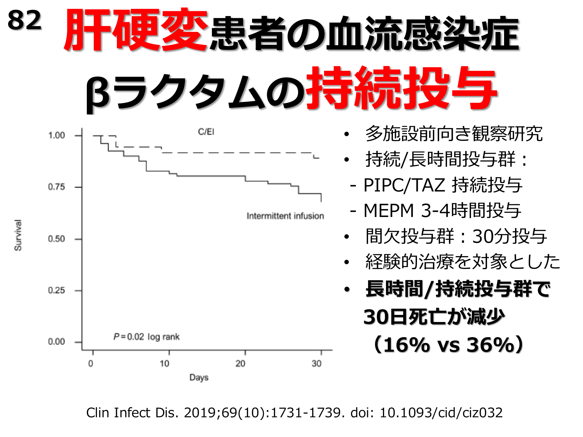 #104. 82 肝硬変患者の血流感染症 βラクタムの持続投与 • • • • 多施設前向き観察研究 持続/長時間投与群: PIPC/TAZ 持続投与 MEPM 3-4時間投与 間欠投与群:30分投与 経験的治療を対象とした • 長時間/持続投与群で 30日死亡が減少 (16% vs 36%) Clin Infect Dis. 2019;69(10):1731-1739. doi: 10.1093/cid/ciz032