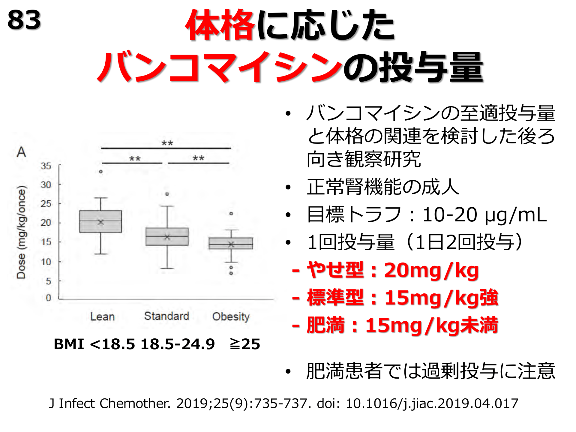 #105. 83 体格に応じた バンコマイシンの投与量 BMI <18.5 18.5-24.9 ≧25 • バンコマイシンの至適投与量 と体格の関連を検討した後ろ 向き観察研究 • 正常腎機能の成人 • 目標トラフ:10-20 µg/mL • 1回投与量(1日2回投与) - やせ型:20mg/kg - 標準型:15mg/kg強 - 肥満:15mg/kg未満 • 肥満患者では過剰投与に注意 J Infect Chemother. 2019;25(9):735-737. doi: 10.1016/j.jiac.2019.04.017