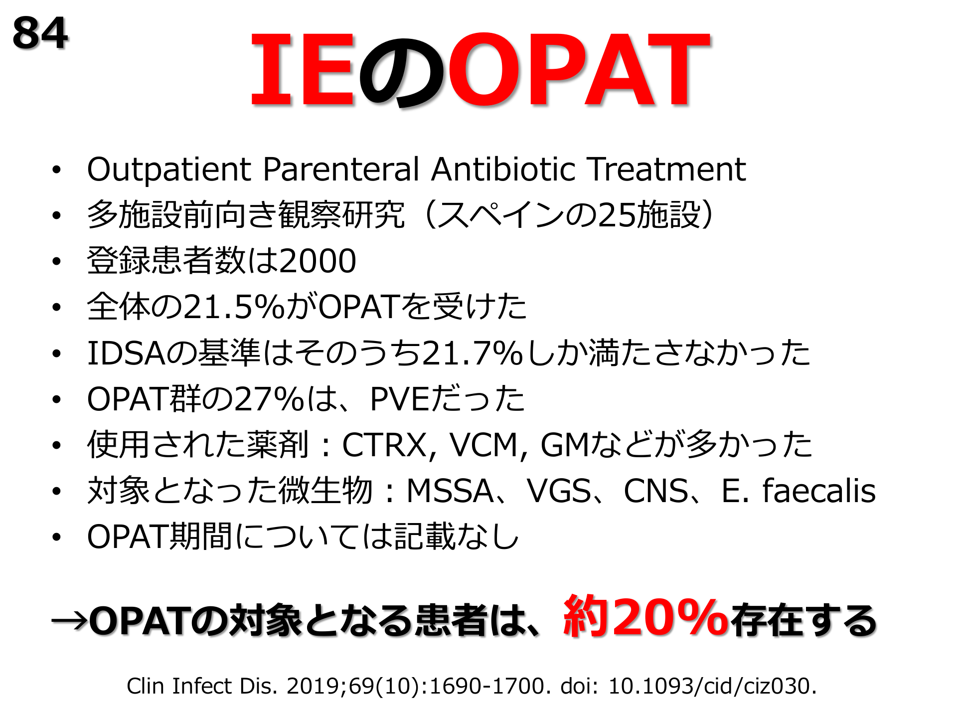 #106. 84 • • • • • • • • • IEのOPAT Outpatient Parenteral Antibiotic Treatment 多施設前向き観察研究(スペインの25施設) 登録患者数は2000 全体の21.5%がOPATを受けた IDSAの基準はそのうち21.7%しか満たさなかった OPAT群の27%は、PVEだった 使用された薬剤:CTRX, VCM, GMなどが多かった 対象となった微生物:MSSA、VGS、CNS、E. faecalis OPAT期間については記載なし →OPATの対象となる患者は、約20%存在する Clin Infect Dis. 2019;69(10):1690-1700. doi: 10.1093/cid/ciz030.