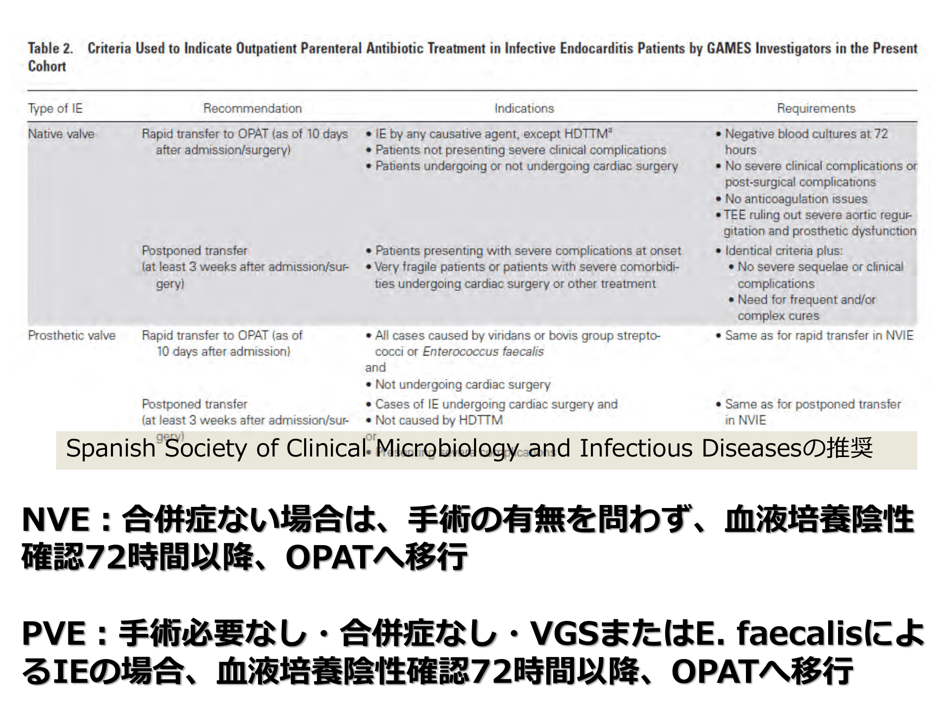 #107. Spanish Society of Clinical Microbiology and Infectious Diseasesの推奨 NVE:合併症ない場合は、手術の有無を問わず、血液培養陰性 確認72時間以降、OPATへ移行 PVE:手術必要なし・合併症なし・VGSまたはE. faecalisによ るIEの場合、血液培養陰性確認72時間以降、OPATへ移行