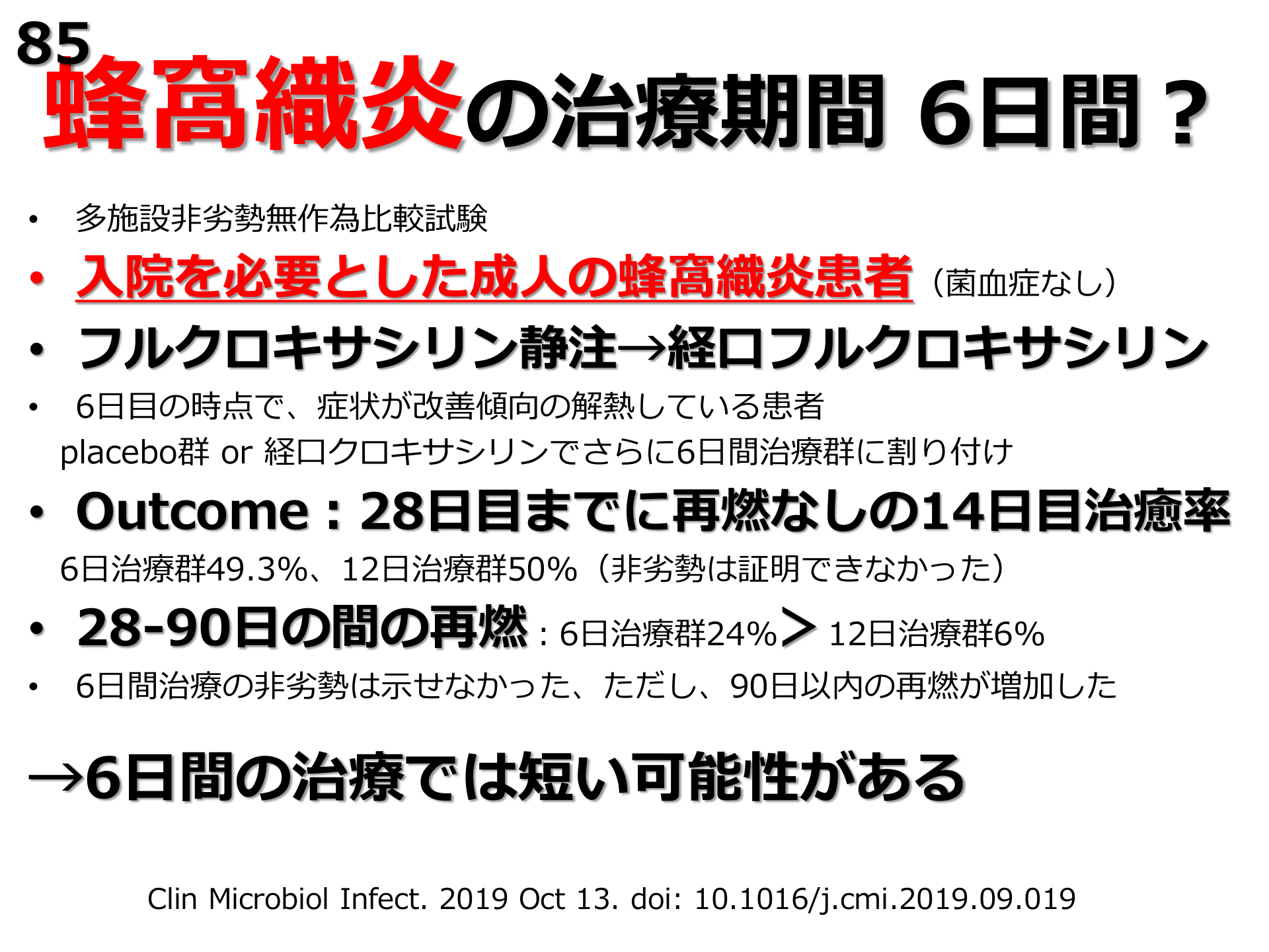 #108. 85 蜂窩織炎の治療期間 6日間? • 多施設非劣勢無作為比較試験 • 入院を必要とした成人の蜂窩織炎患者(菌血症なし) • フルクロキサシリン静注→経口フルクロキサシリン • 6日目の時点で、症状が改善傾向の解熱している患者 placebo群 or 経口クロキサシリンでさらに6日間治療群に割り付け • Outcome:28日目までに再燃なしの14日目治癒率 6日治療群49.3%、12日治療群50%(非劣勢は証明できなかった) • 28-90日の間の再燃:6日治療群24%>12日治療群6% • 6日間治療の非劣勢は示せなかった、ただし、90日以内の再燃が増加した →6日間の治療では短い可能性がある Clin Microbiol Infect. 2019 Oct 13. doi: 10.1016/j.cmi.2019.09.019