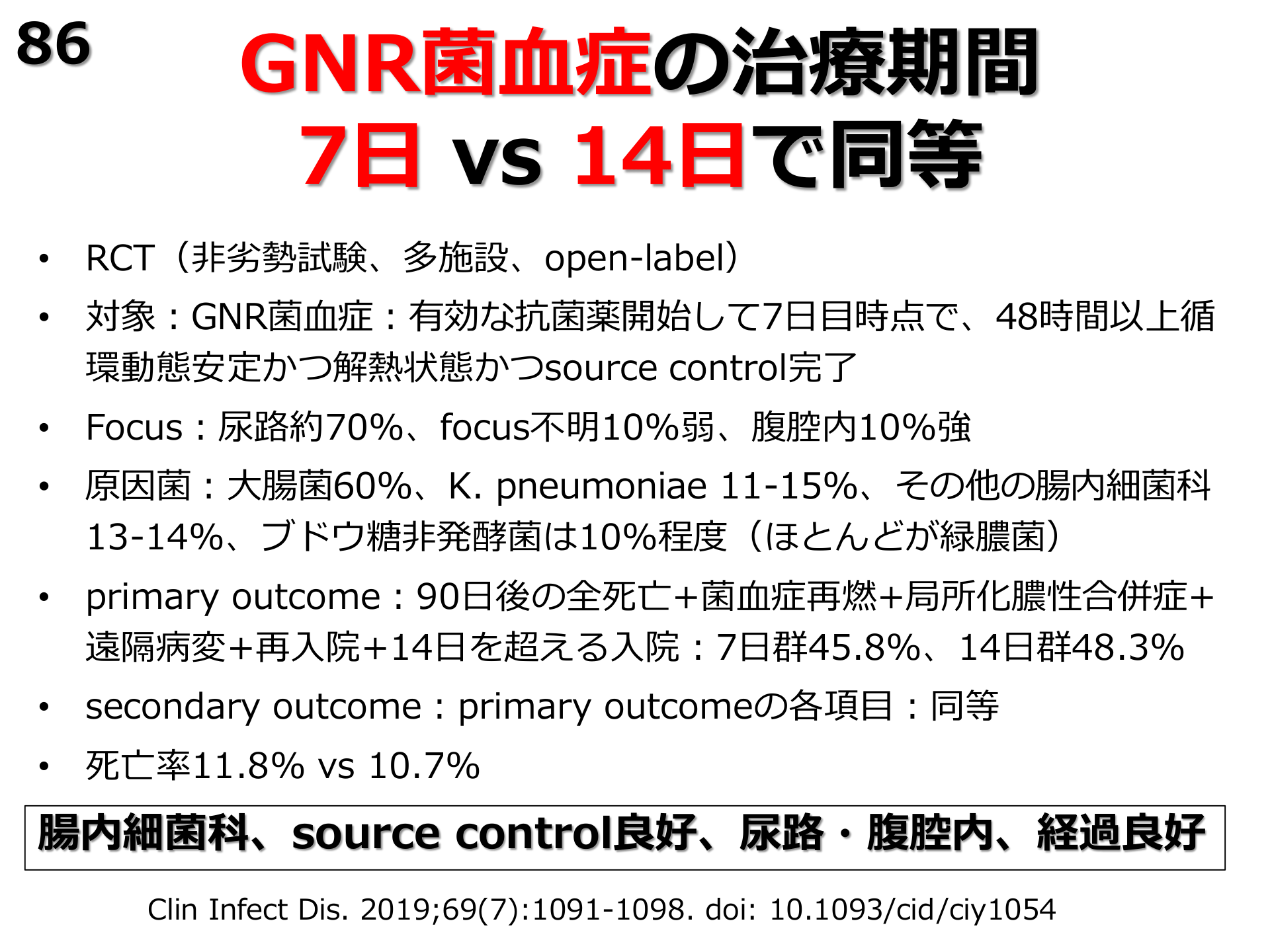 #109. 86 GNR菌血症の治療期間 7日 vs 14日で同等 • RCT(非劣勢試験、多施設、open-label) • 対象:GNR菌血症:有効な抗菌薬開始して7日目時点で、48時間以上循 環動態安定かつ解熱状態かつsource control完了 • Focus:尿路約70%、focus不明10%弱、腹腔内10%強 • 原因菌:大腸菌60%、K. pneumoniae 11-15%、その他の腸内細菌科 13-14%、ブドウ糖非発酵菌は10%程度(ほとんどが緑膿菌) • primary outcome:90日後の全死亡+菌血症再燃+局所化膿性合併症+ 遠隔病変+再入院+14日を超える入院:7日群45.8%、14日群48.3% • secondary outcome:primary outcomeの各項目:同等 • 死亡率11.8% vs 10.7% 腸内細菌科、source control良好、尿路・腹腔内、経過良好 Clin Infect Dis. 2019;69(7):1091-1098. doi: 10.1093/cid/ciy1054