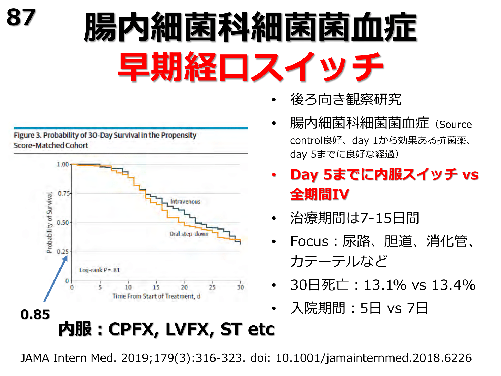 #110. 87 腸内細菌科細菌菌血症 早期経口スイッチ • 後ろ向き観察研究 • 腸内細菌科細菌菌血症(Source control良好、day 1から効果ある抗菌薬、 day 5までに良好な経過) • Day 5までに内服スイッチ vs 全期間IV • 治療期間は7-15日間 • Focus:尿路、胆道、消化管、 カテーテルなど • 30日死亡:13.1% vs 13.4% 0.85 • 入院期間:5日 vs 7日 内服:CPFX, LVFX, ST etc JAMA Intern Med. 2019;179(3):316-323. doi: 10.1001/jamainternmed.2018.6226