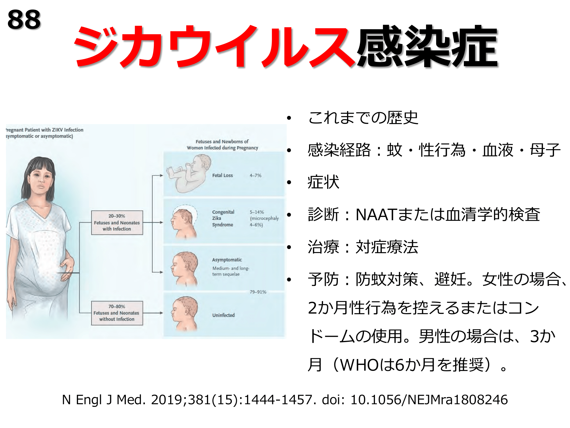 #112. 88 ジカウイルス感染症 • これまでの歴史 • 感染経路:蚊・性行為・血液・母子 • 症状 • 診断:NAATまたは血清学的検査 • 治療:対症療法 • 予防:防蚊対策、避妊。女性の場合、 2か月性行為を控えるまたはコン ドームの使用。男性の場合は、3か 月(WHOは6か月を推奨)。 N Engl J Med. 2019;381(15):1444-1457. doi: 10.1056/NEJMra1808246