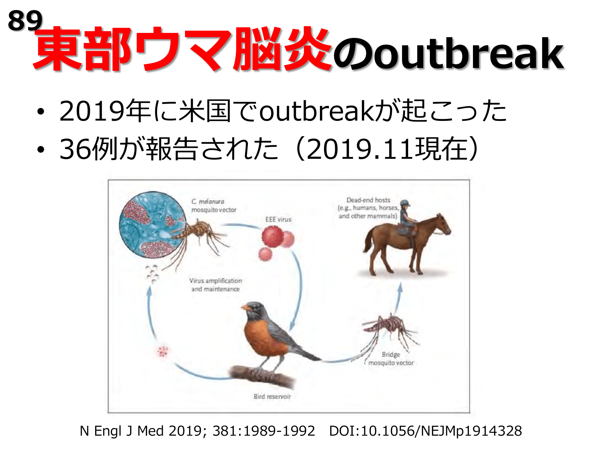 #113. 89 東部ウマ脳炎のoutbreak • 2019年に米国でoutbreakが起こった • 36例が報告された(2019.11現在) N Engl J Med 2019; 381:1989-1992 DOI:10.1056/NEJMp1914328