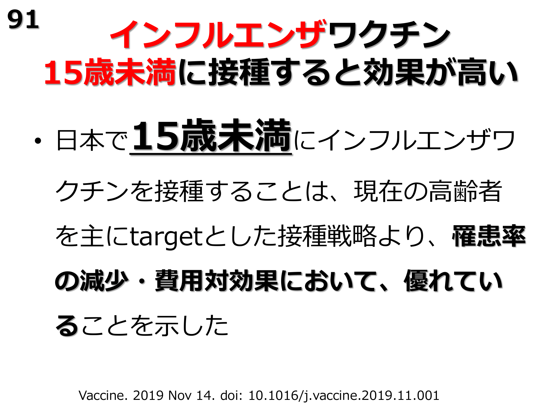 #116. 91 インフルエンザワクチン 15歳未満に接種すると効果が高い • 日本で15歳未満にインフルエンザワ クチンを接種することは、現在の高齢者 を主にtargetとした接種戦略より、罹患率 の減少・費用対効果において、優れてい ることを示した Vaccine. 2019 Nov 14. doi: 10.1016/j.vaccine.2019.11.001