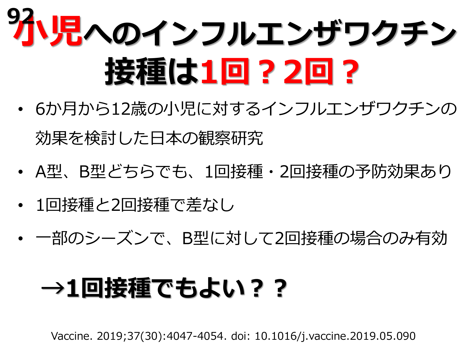 #117. 92 小児へのインフルエンザワクチン 接種は1回?2回? • 6か月から12歳の小児に対するインフルエンザワクチンの 効果を検討した日本の観察研究 • A型、B型どちらでも、1回接種・2回接種の予防効果あり • 1回接種と2回接種で差なし • 一部のシーズンで、B型に対して2回接種の場合のみ有効 →1回接種でもよい?? Vaccine. 2019;37(30):4047-4054. doi: 10.1016/j.vaccine.2019.05.090