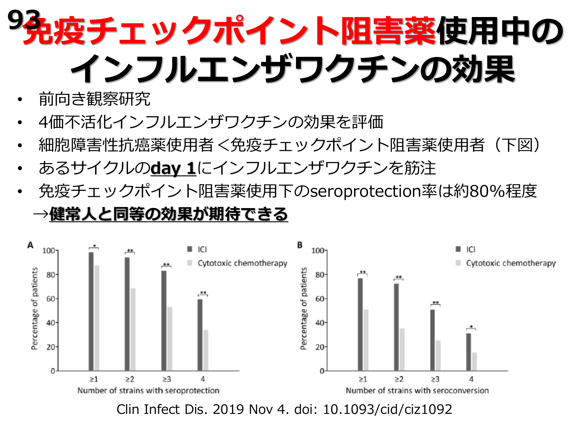 #118. 93 免疫チェックポイント阻害薬使用中の インフルエンザワクチンの効果 • • • • • 前向き観察研究 4価不活化インフルエンザワクチンの効果を評価 細胞障害性抗癌薬使用者<免疫チェックポイント阻害薬使用者(下図) あるサイクルのday 1にインフルエンザワクチンを筋注 免疫チェックポイント阻害薬使用下のseroprotection率は約80%程度 →健常人と同等の効果が期待できる Clin Infect Dis. 2019 Nov 4. doi: 10.1093/cid/ciz1092