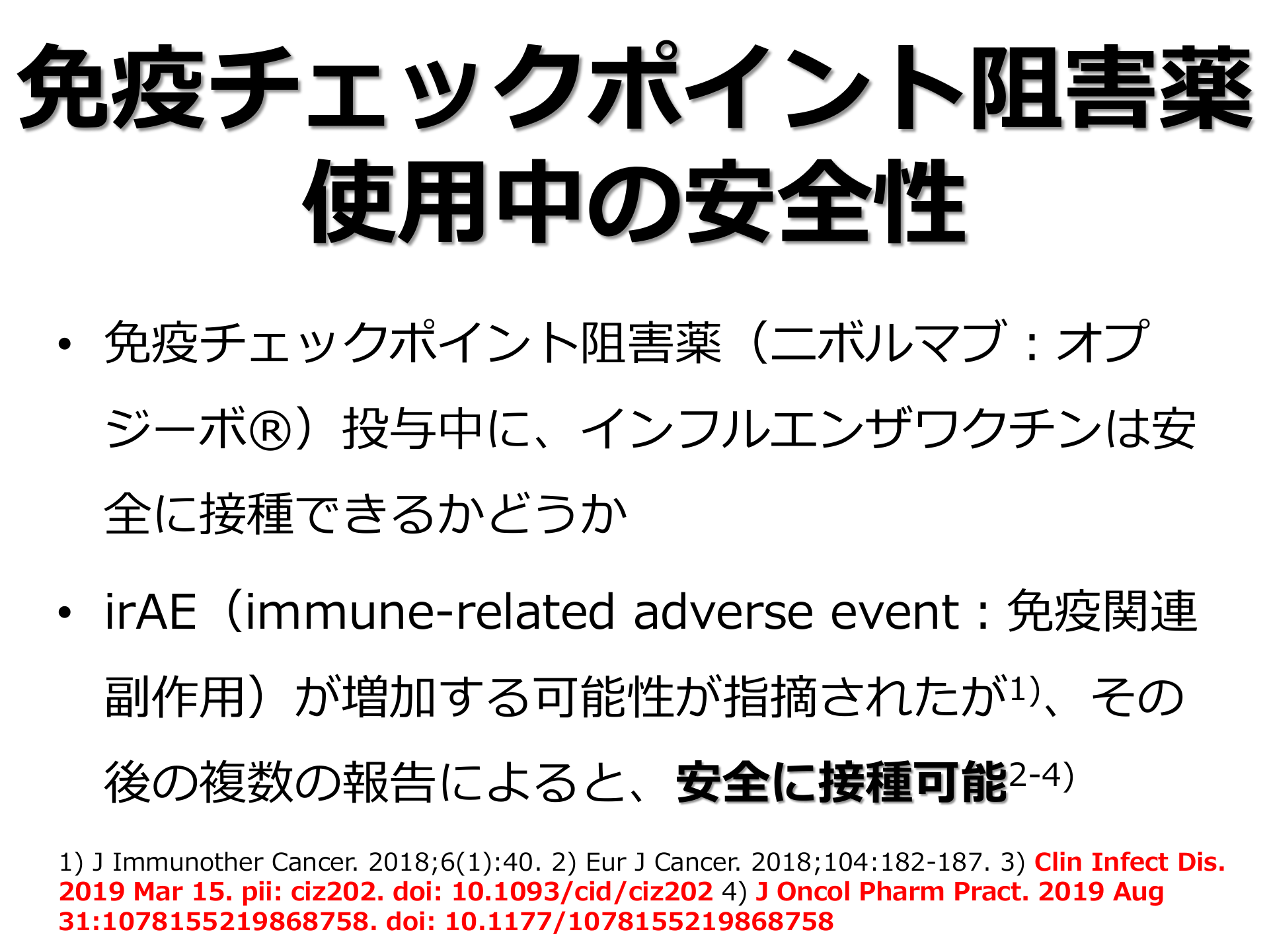 #119. 免疫チェックポイント阻害薬 使用中の安全性 • 免疫チェックポイント阻害薬(ニボルマブ:オプ ジーボ®)投与中に、インフルエンザワクチンは安 全に接種できるかどうか • irAE(immune-related adverse event:免疫関連 副作用)が増加する可能性が指摘されたが1)、その 後の複数の報告によると、安全に接種可能2-4) 1) J Immunother Cancer. 2018;6(1):40. 2) Eur J Cancer. 2018;104:182-187. 3) Clin Infect Dis. 2019 Mar 15. pii: ciz202. doi: 10.1093/cid/ciz202 4) J Oncol Pharm Pract. 2019 Aug 31:1078155219868758. doi: 10.1177/1078155219868758
