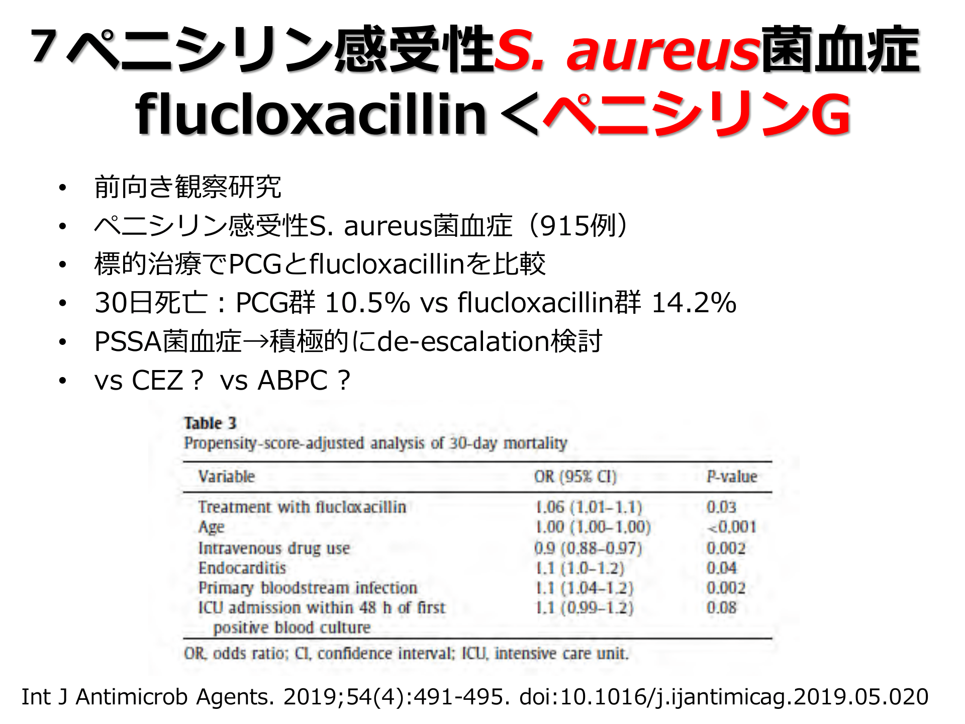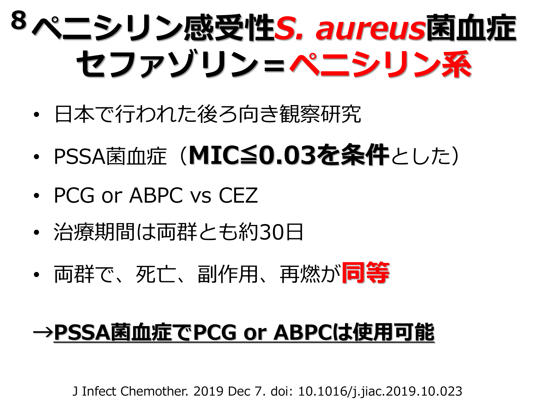 #12. 7 ペニシリン感受性S. aureus菌血症 flucloxacillin<ペニシリンG • • • • • • 前向き観察研究 ペニシリン感受性S. aureus菌血症(915例) 標的治療でPCGとflucloxacillinを比較 30日死亡:PCG群 10.5% vs flucloxacillin群 14.2% PSSA菌血症→積極的にde-escalation検討 vs CEZ? vs ABPC ? Int J Antimicrob Agents. 2019;54(4):491-495. doi:10.1016/j.ijantimicag.2019.05.020