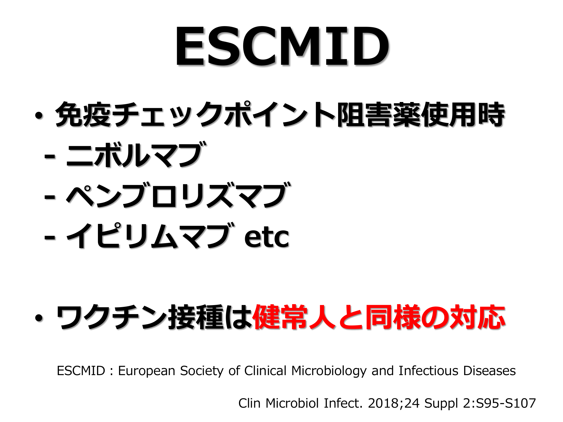 #120. ESCMID • 免疫チェックポイント阻害薬使用時 - ニボルマブ - ペンブロリズマブ - イピリムマブ etc • ワクチン接種は健常人と同様の対応 ESCMID:European Society of Clinical Microbiology and Infectious Diseases Clin Microbiol Infect. 2018;24 Suppl 2:S95-S107
