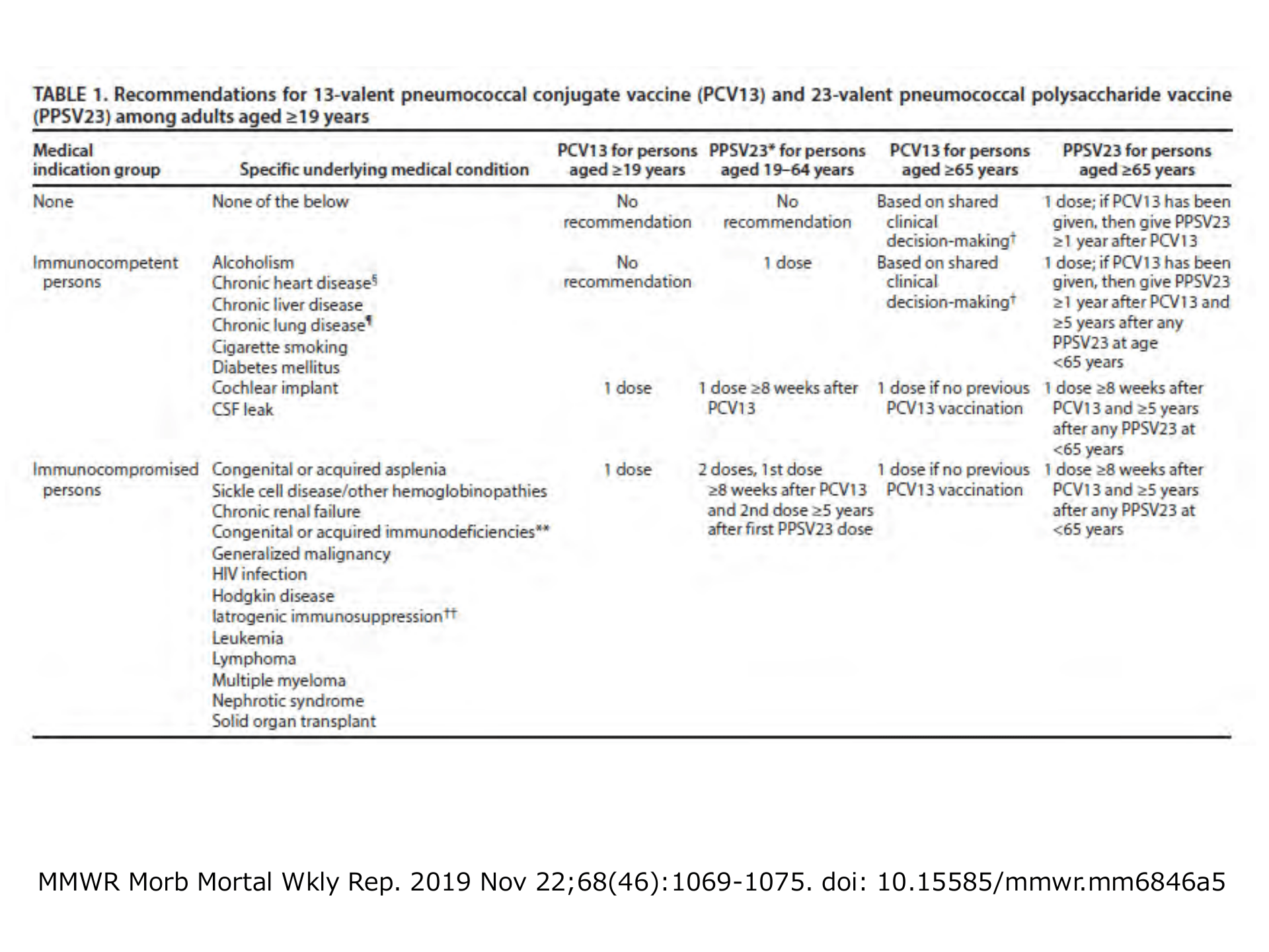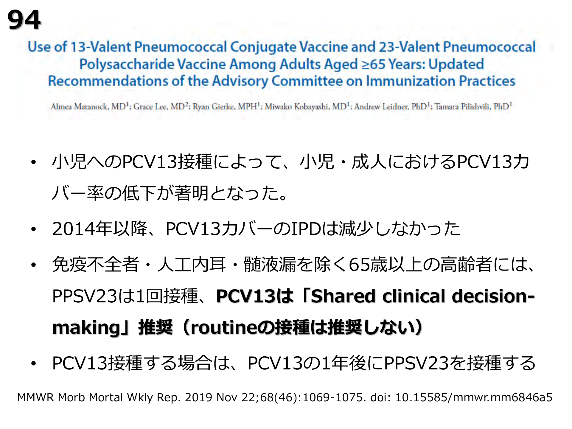 #121. 94 • 小児へのPCV13接種によって、小児・成人におけるPCV13カ バー率の低下が著明となった。 • 2014年以降、PCV13カバーのIPDは減少しなかった • 免疫不全者・人工内耳・髄液漏を除く65歳以上の高齢者には、 PPSV23は1回接種、PCV13は「Shared clinical decision- making」推奨(routineの接種は推奨しない) • PCV13接種する場合は、PCV13の1年後にPPSV23を接種する MMWR Morb Mortal Wkly Rep. 2019 Nov 22;68(46):1069-1075. doi: 10.15585/mmwr.mm6846a5