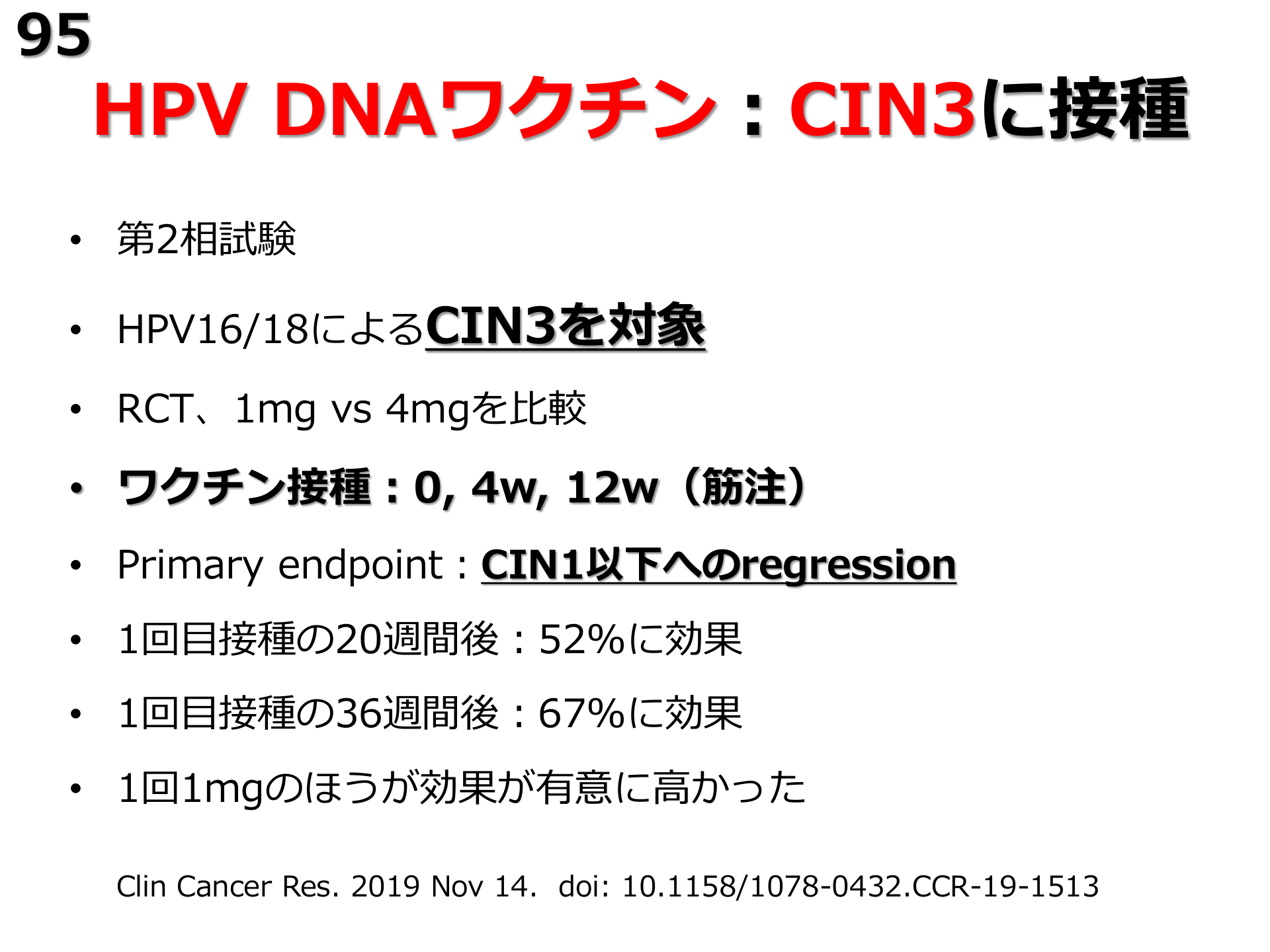 #124. 95 HPV DNAワクチン:CIN3に接種 • 第2相試験 • HPV16/18によるCIN3を対象 • RCT、1mg vs 4mgを比較 • ワクチン接種:0, 4w, 12w(筋注) • Primary endpoint:CIN1以下へのregression • 1回目接種の20週間後:52%に効果 • 1回目接種の36週間後:67%に効果 • 1回1mgのほうが効果が有意に高かった Clin Cancer Res. 2019 Nov 14. doi: 10.1158/1078-0432.CCR-19-1513