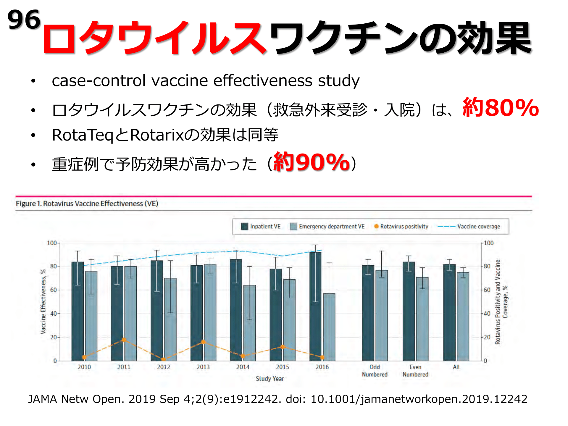 #125. 96 ロタウイルスワクチンの効果 • case-control vaccine effectiveness study • ロタウイルスワクチンの効果(救急外来受診・入院)は、約80% • RotaTeqとRotarixの効果は同等 • 重症例で予防効果が高かった(約90%) JAMA Netw Open. 2019 Sep 4;2(9):e1912242. doi: 10.1001/jamanetworkopen.2019.12242