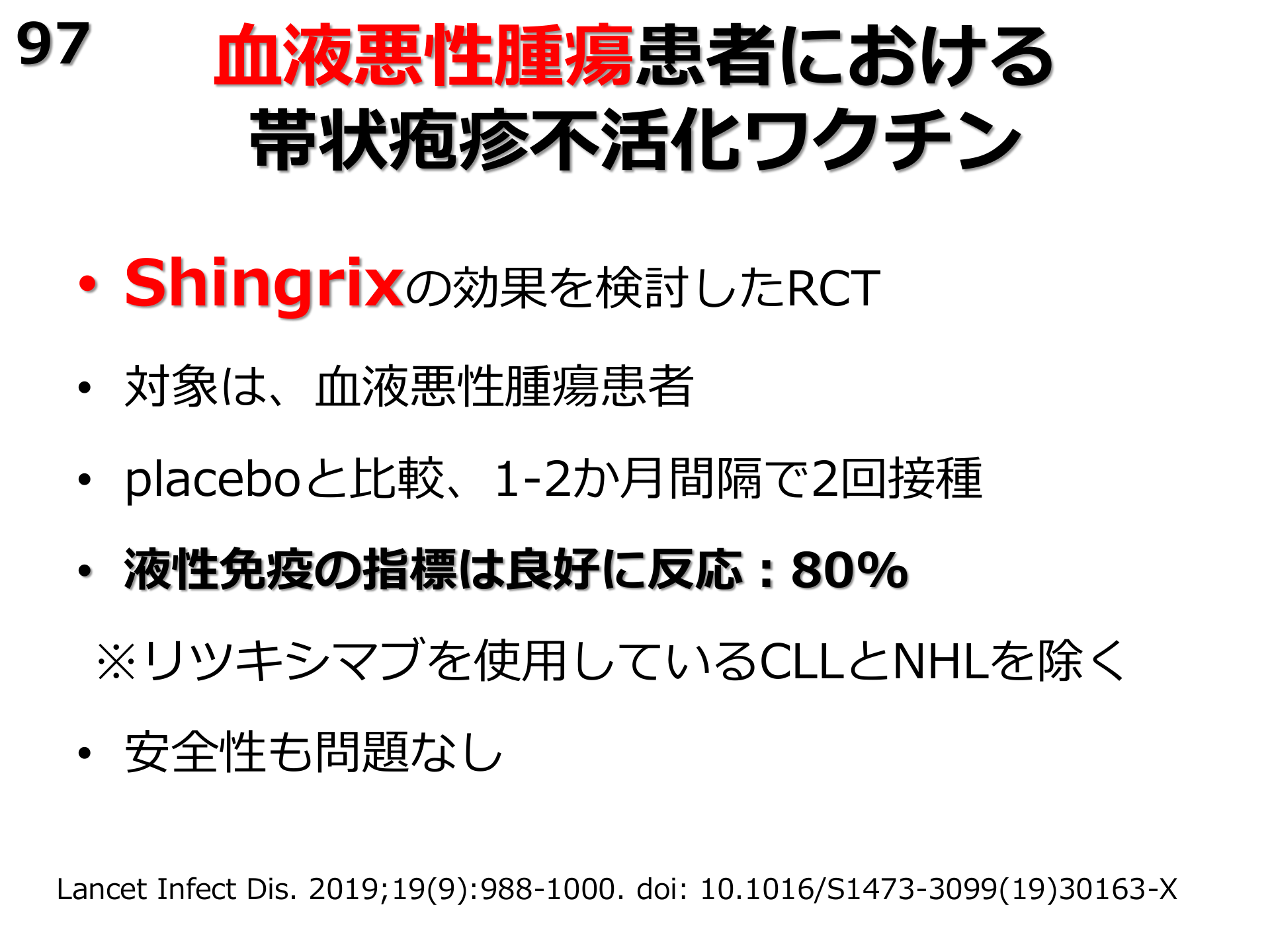 #127. 97 血液悪性腫瘍患者における 帯状疱疹不活化ワクチン • Shingrixの効果を検討したRCT • 対象は、血液悪性腫瘍患者 • placeboと比較、1-2か月間隔で2回接種 • 液性免疫の指標は良好に反応:80% ※リツキシマブを使用しているCLLとNHLを除く • 安全性も問題なし Lancet Infect Dis. 2019;19(9):988-1000. doi: 10.1016/S1473-3099(19)30163-X