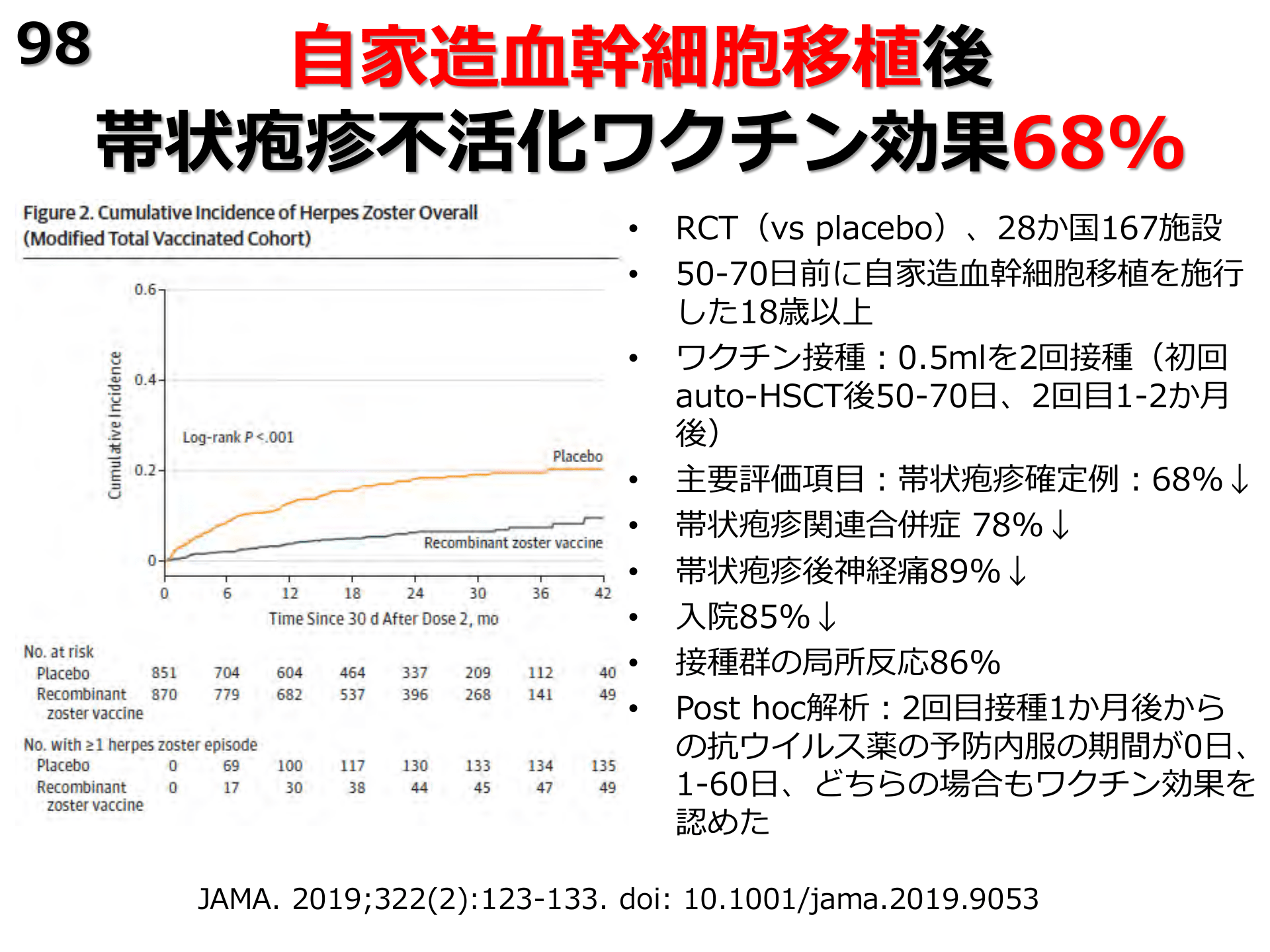 #128. 98 自家造血幹細胞移植後 帯状疱疹不活化ワクチン効果68% • • • • • • • • • RCT(vs placebo)、28か国167施設 50-70日前に自家造血幹細胞移植を施行 した18歳以上 ワクチン接種:0.5mlを2回接種(初回 auto-HSCT後50-70日、2回目1-2か月 後) 主要評価項目:帯状疱疹確定例:68%↓ 帯状疱疹関連合併症 78%↓ 帯状疱疹後神経痛89%↓ 入院85%↓ 接種群の局所反応86% Post hoc解析:2回目接種1か月後から の抗ウイルス薬の予防内服の期間が0日、 1-60日、どちらの場合もワクチン効果を 認めた JAMA. 2019;322(2):123-133. doi: 10.1001/jama.2019.9053