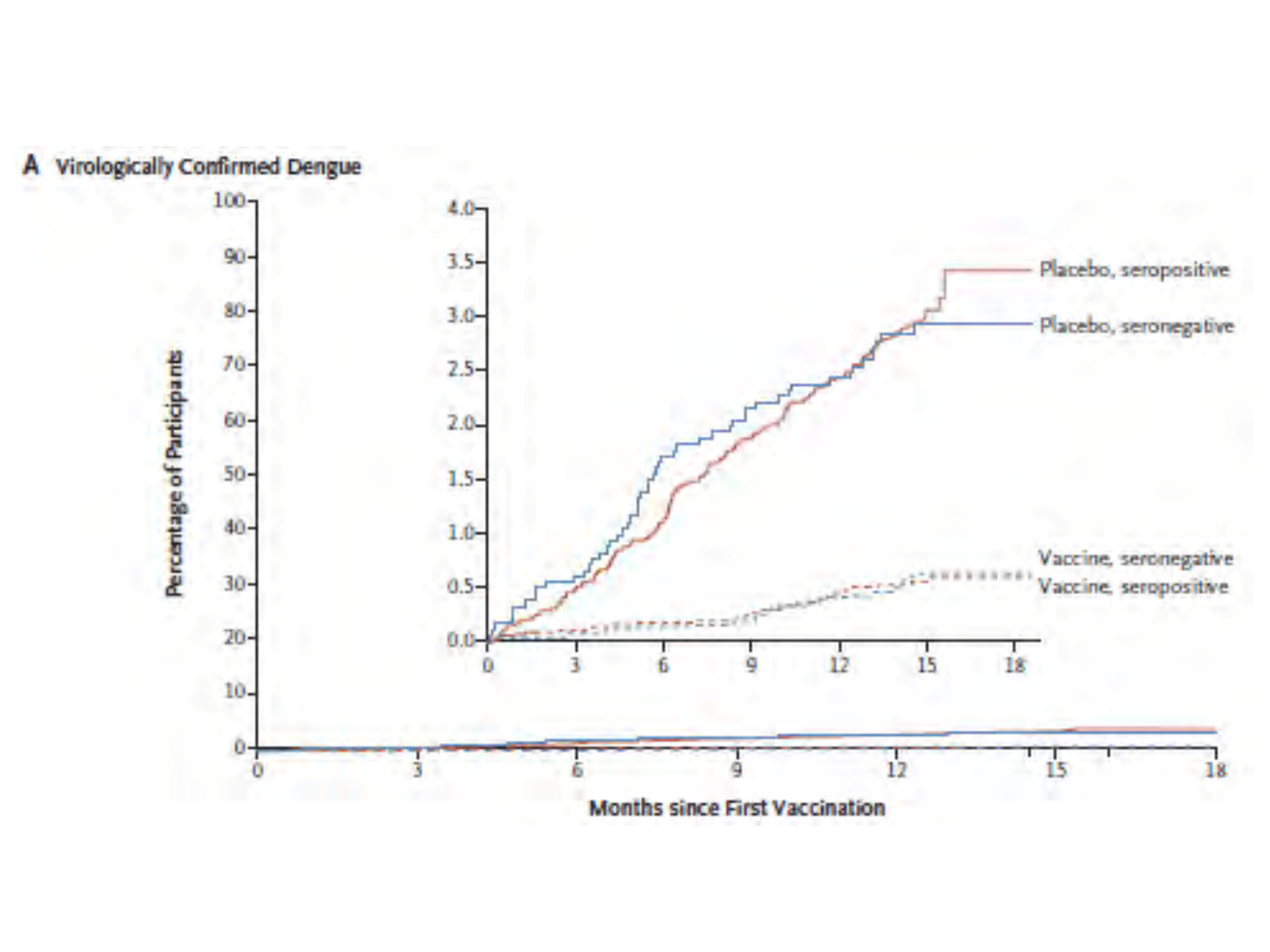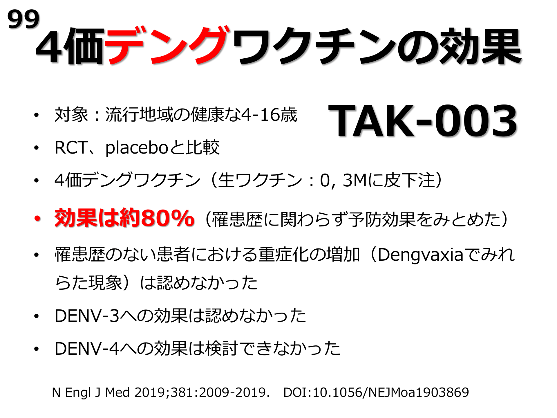 #129. 99 4価デングワクチンの効果 • 対象:流行地域の健康な4-16歳 • RCT、placeboと比較 TAK-003 • 4価デングワクチン(生ワクチン:0, 3Mに皮下注) • 効果は約80%(罹患歴に関わらず予防効果をみとめた) • 罹患歴のない患者における重症化の増加(Dengvaxiaでみれ らた現象)は認めなかった • DENV-3への効果は認めなかった • DENV-4への効果は検討できなかった N Engl J Med 2019;381:2009-2019. DOI:10.1056/NEJMoa1903869