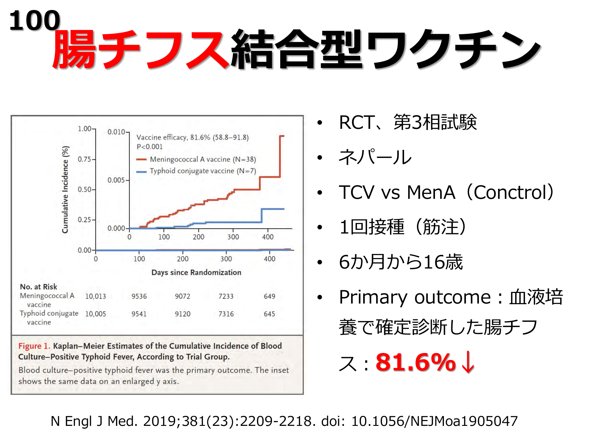 #131. 100 腸チフス結合型ワクチン • RCT、第3相試験 • ネパール • TCV vs MenA(Conctrol) • 1回接種(筋注) • 6か月から16歳 • Primary outcome:血液培 養で確定診断した腸チフ ス:81.6%↓ N Engl J Med. 2019;381(23):2209-2218. doi: 10.1056/NEJMoa1905047
