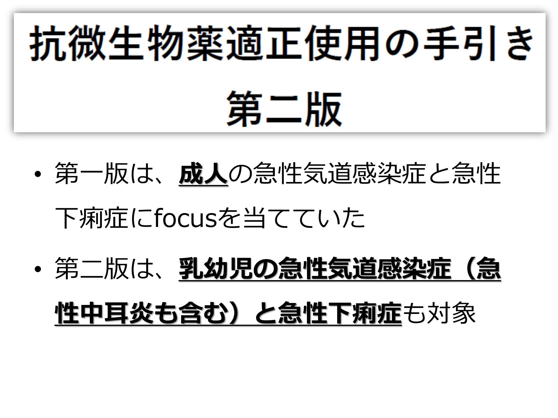 #133. • 第一版は、成人の急性気道感染症と急性 下痢症にfocusを当てていた • 第二版は、乳幼児の急性気道感染症(急 性中耳炎も含む)と急性下痢症も対象