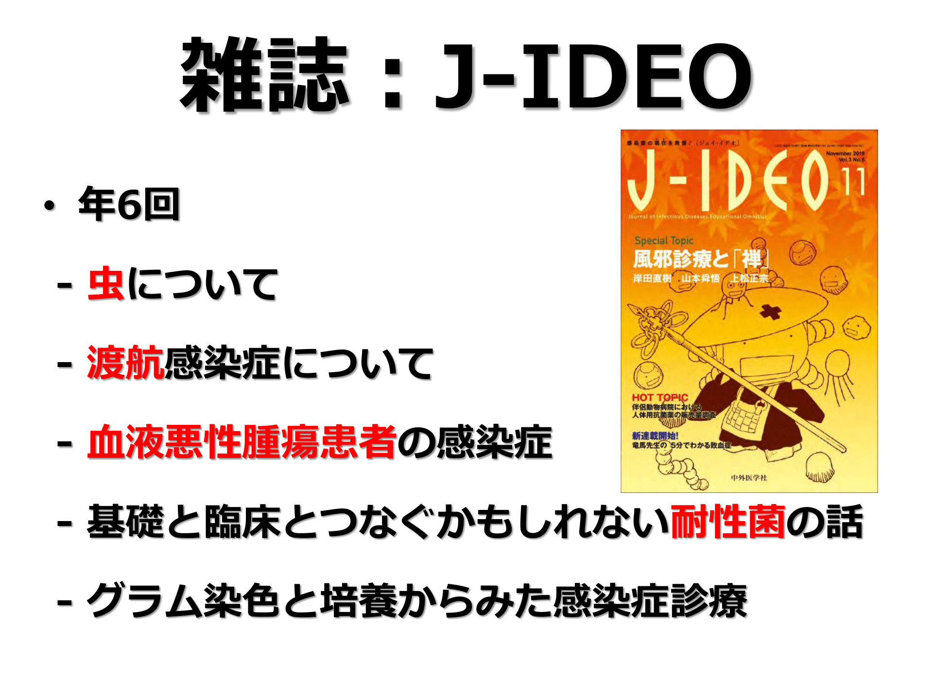 #135. 雑誌:J-IDEO • 年6回 - 虫について - 渡航感染症について - 血液悪性腫瘍患者の感染症 - 基礎と臨床とつなぐかもしれない耐性菌の話 - グラム染色と培養からみた感染症診療