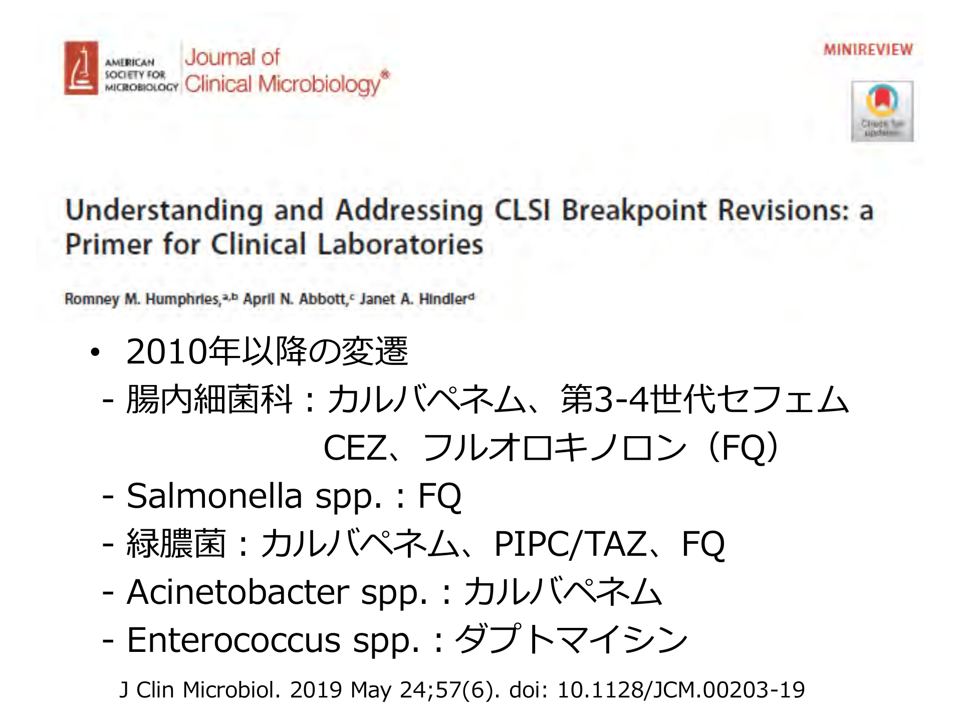 #137. • 2010年以降の変遷 - 腸内細菌科:カルバペネム、第3-4世代セフェム CEZ、フルオロキノロン(FQ) - Salmonella spp.:FQ - 緑膿菌:カルバペネム、PIPC/TAZ、FQ - Acinetobacter spp.:カルバペネム - Enterococcus spp.:ダプトマイシン J Clin Microbiol. 2019 May 24;57(6). doi: 10.1128/JCM.00203-19