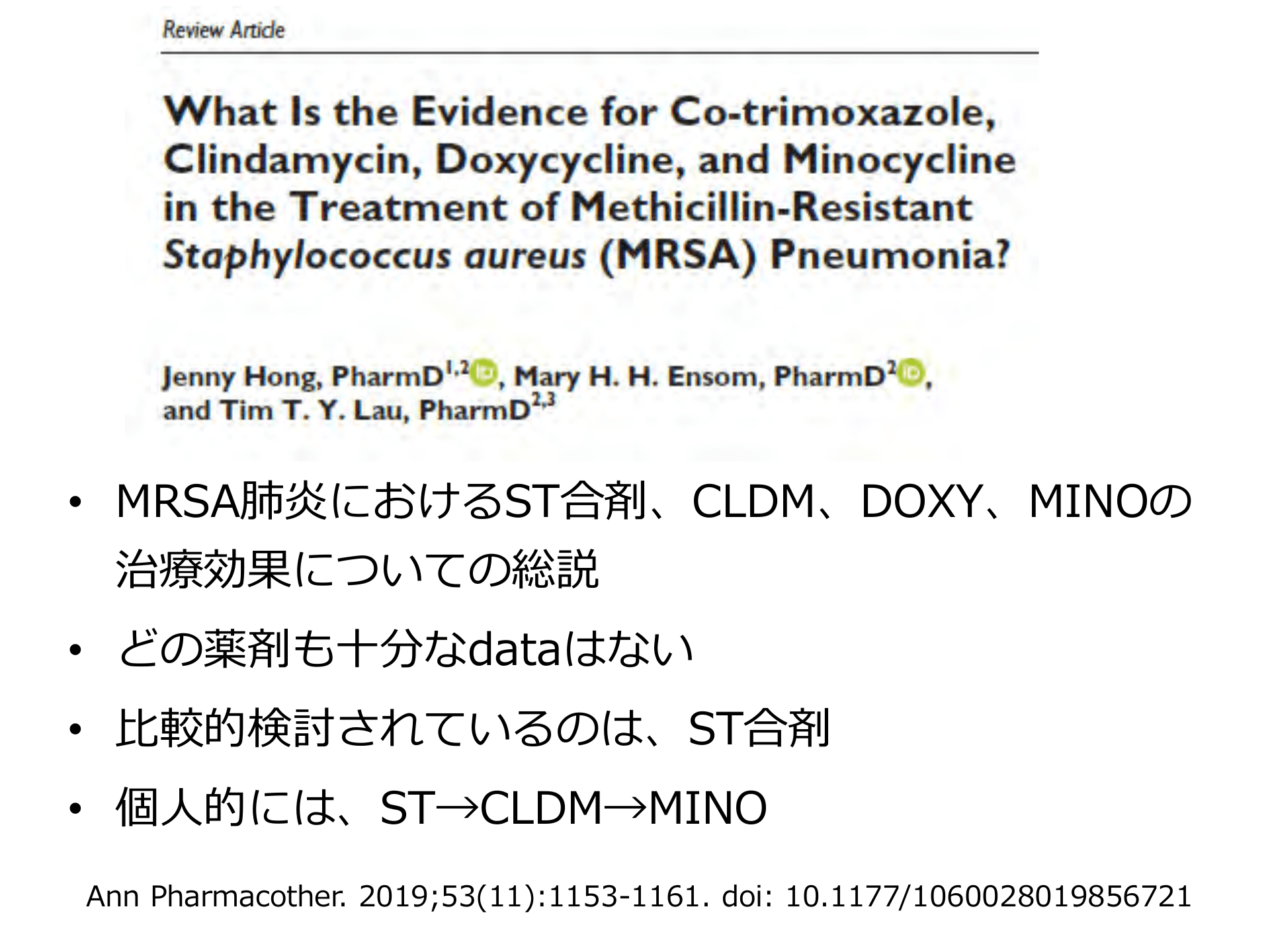 #138. • MRSA肺炎におけるST合剤、CLDM、DOXY、MINOの 治療効果についての総説 • どの薬剤も十分なdataはない • 比較的検討されているのは、ST合剤 • 個人的には、ST→CLDM→MINO Ann Pharmacother. 2019;53(11):1153-1161. doi: 10.1177/1060028019856721