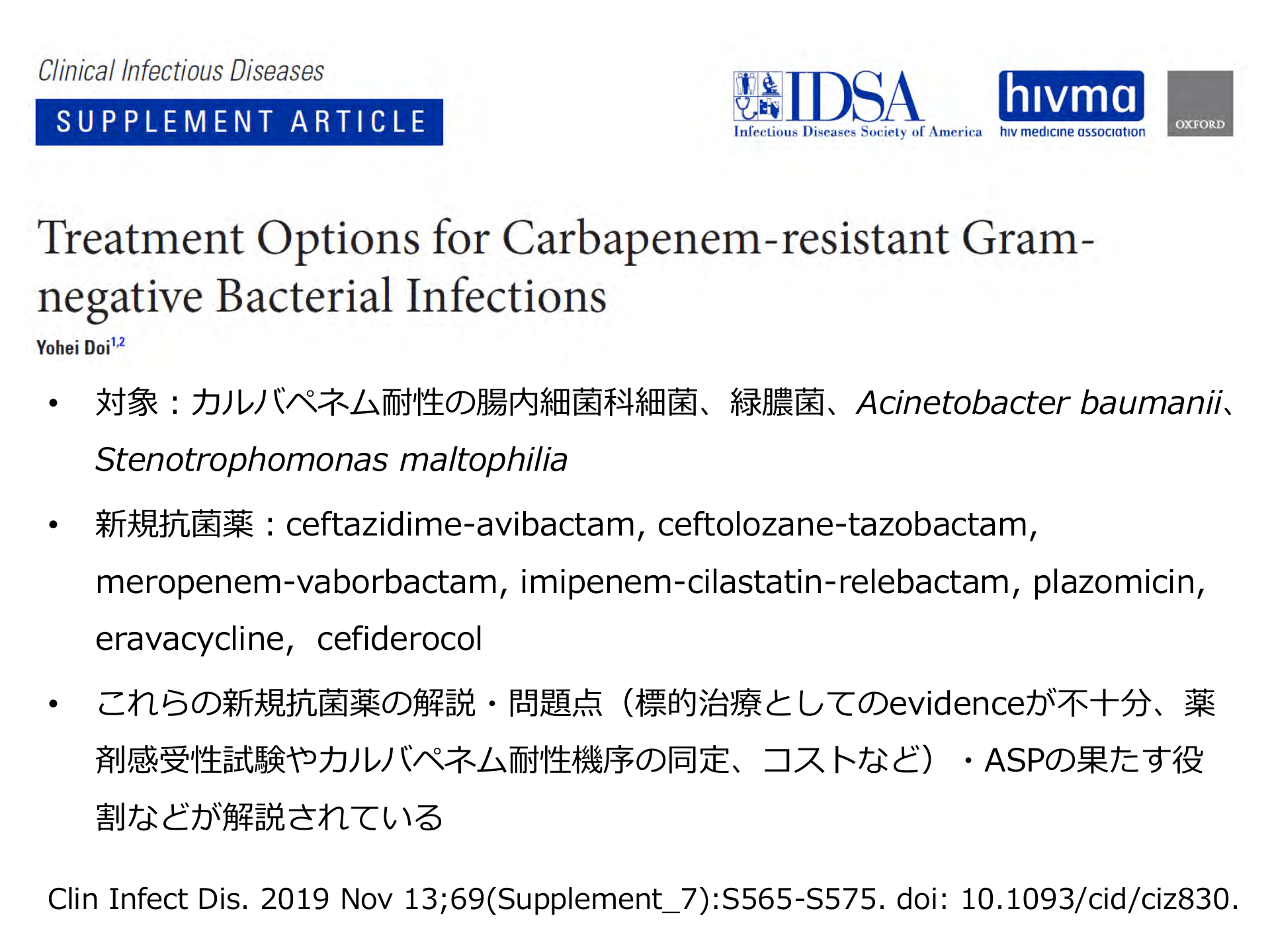 #139. • 対象:カルバペネム耐性の腸内細菌科細菌、緑膿菌、Acinetobacter baumanii、 Stenotrophomonas maltophilia • 新規抗菌薬:ceftazidime-avibactam, ceftolozane-tazobactam, meropenem-vaborbactam, imipenem-cilastatin-relebactam, plazomicin, eravacycline, cefiderocol • これらの新規抗菌薬の解説・問題点(標的治療としてのevidenceが不十分、薬 剤感受性試験やカルバペネム耐性機序の同定、コストなど)・ASPの果たす役 割などが解説されている Clin Infect Dis. 2019 Nov 13;69(Supplement_7):S565-S575. doi: 10.1093/cid/ciz830.