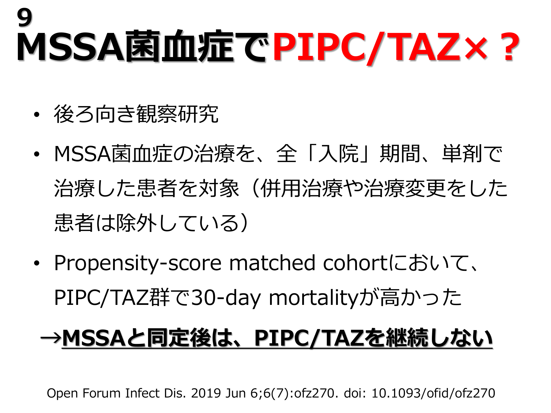 #14. 9 MSSA菌血症でPIPC/TAZ×? • 後ろ向き観察研究 • MSSA菌血症の治療を、全「入院」期間、単剤で 治療した患者を対象(併用治療や治療変更をした 患者は除外している) • Propensity-score matched cohortにおいて、 PIPC/TAZ群で30-day mortalityが高かった →MSSAと同定後は、PIPC/TAZを継続しない Open Forum Infect Dis. 2019 Jun 6;6(7):ofz270. doi: 10.1093/ofid/ofz270