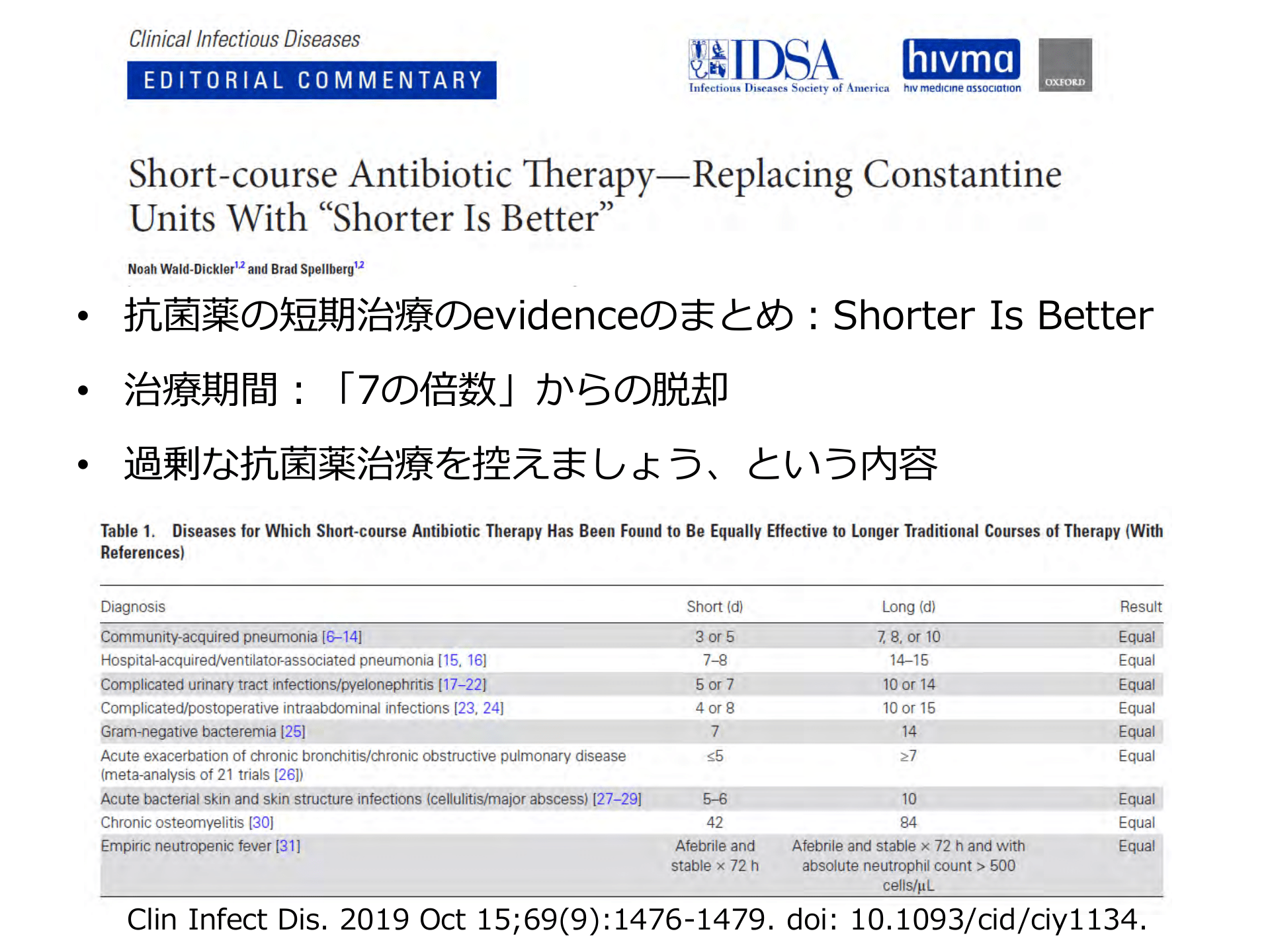 #140. • 抗菌薬の短期治療のevidenceのまとめ:Shorter Is Better • 治療期間:「7の倍数」からの脱却 • 過剰な抗菌薬治療を控えましょう、という内容 Clin Infect Dis. 2019 Oct 15;69(9):1476-1479. doi: 10.1093/cid/ciy1134.