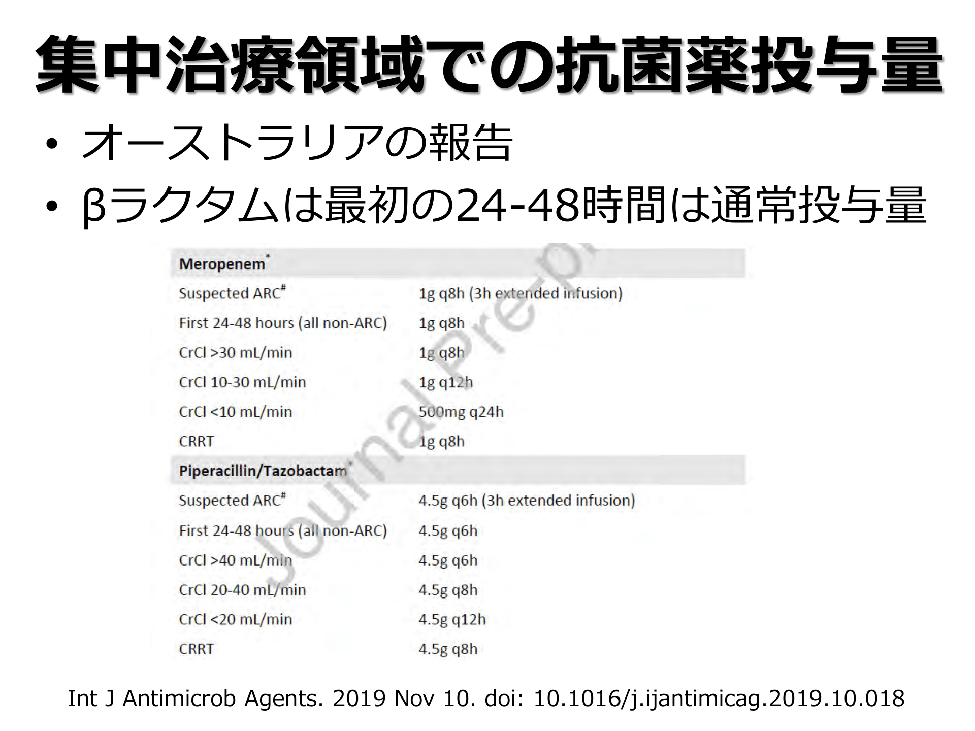 #141. 集中治療領域での抗菌薬投与量 • オーストラリアの報告 • βラクタムは最初の24-48時間は通常投与量 Int J Antimicrob Agents. 2019 Nov 10. doi: 10.1016/j.ijantimicag.2019.10.018