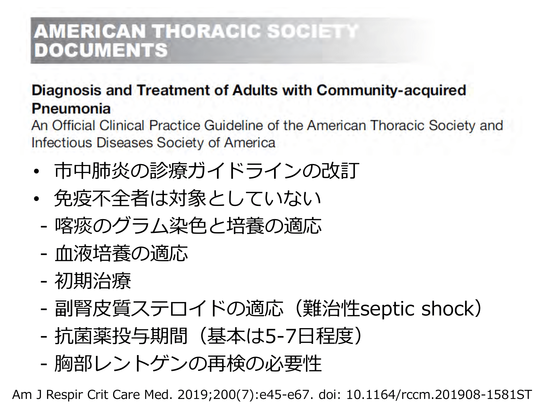 #142. • • - 市中肺炎の診療ガイドラインの改訂 免疫不全者は対象としていない 喀痰のグラム染色と培養の適応 血液培養の適応 初期治療 副腎皮質ステロイドの適応(難治性septic shock) 抗菌薬投与期間(基本は5-7日程度) 胸部レントゲンの再検の必要性 Am J Respir Crit Care Med. 2019;200(7):e45-e67. doi: 10.1164/rccm.201908-1581ST