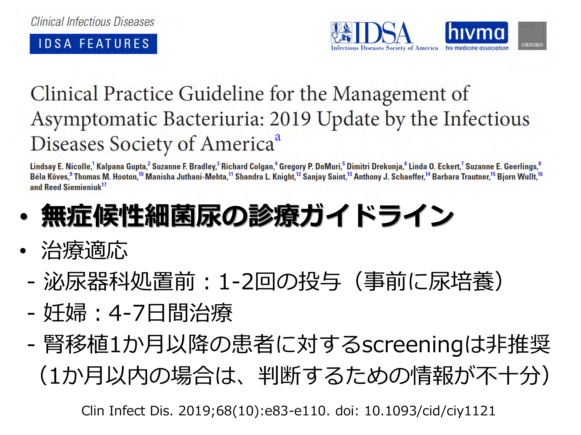#143. • 無症候性細菌尿の診療ガイドライン • 治療適応 - 泌尿器科処置前:1-2回の投与(事前に尿培養) - 妊婦:4-7日間治療 - 腎移植1か月以降の患者に対するscreeningは非推奨 (1か月以内の場合は、判断するための情報が不十分) Clin Infect Dis. 2019;68(10):e83-e110. doi: 10.1093/cid/ciy1121