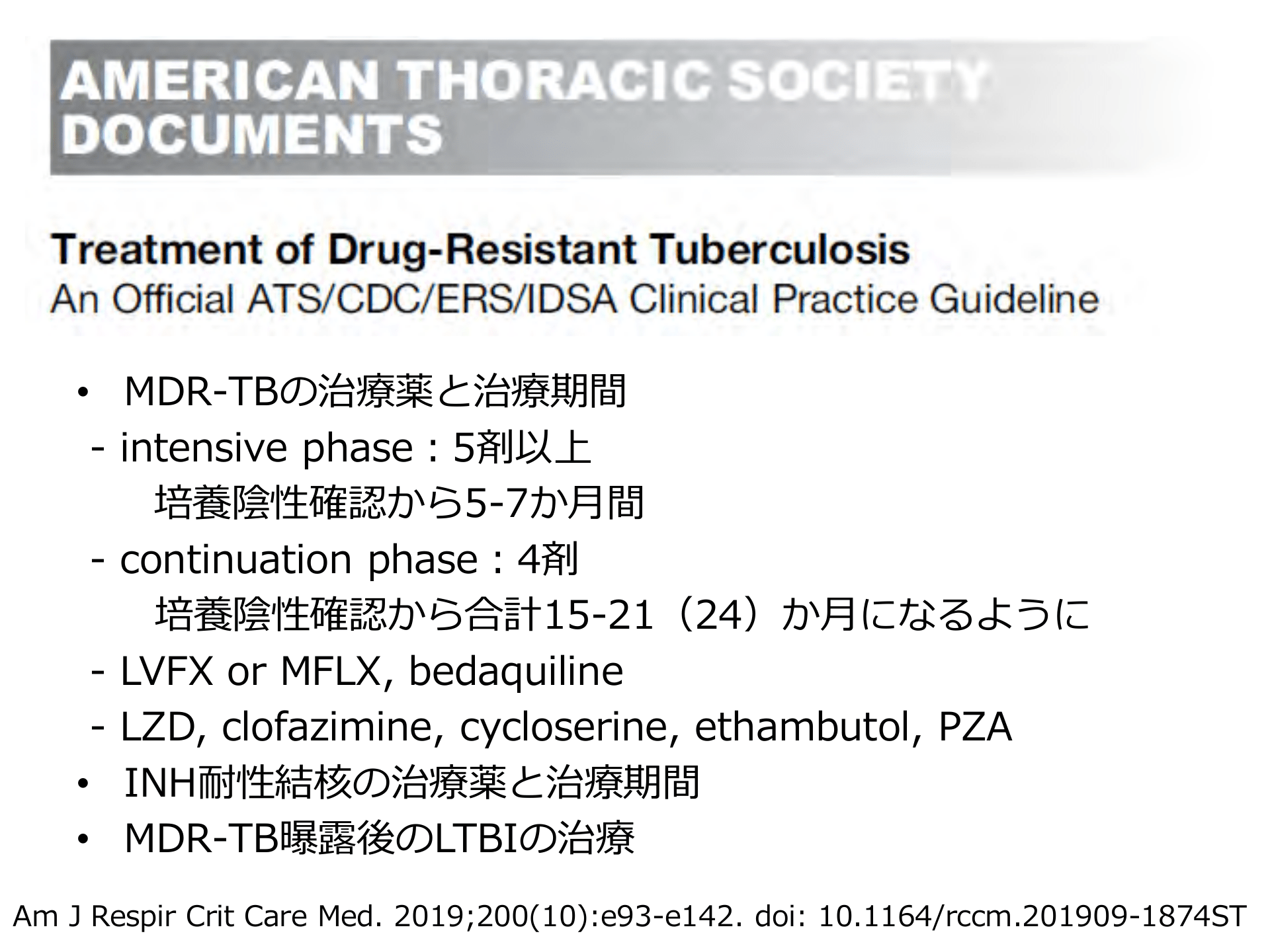 #144. • MDR-TBの治療薬と治療期間 - intensive phase:5剤以上 培養陰性確認から5-7か月間 - continuation phase:4剤 培養陰性確認から合計15-21(24)か月になるように - LVFX or MFLX, bedaquiline - LZD, clofazimine, cycloserine, ethambutol, PZA • INH耐性結核の治療薬と治療期間 • MDR-TB曝露後のLTBIの治療 Am J Respir Crit Care Med. 2019;200(10):e93-e142. doi: 10.1164/rccm.201909-1874ST