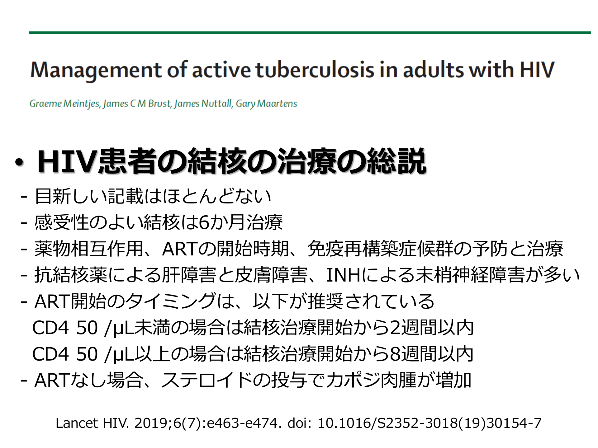 #146. • HIV患者の結核の治療の総説 - 目新しい記載はほとんどない 感受性のよい結核は6か月治療 薬物相互作用、ARTの開始時期、免疫再構築症候群の予防と治療 抗結核薬による肝障害と皮膚障害、INHによる末梢神経障害が多い ART開始のタイミングは、以下が推奨されている CD4 50 /µL未満の場合は結核治療開始から2週間以内 CD4 50 /µL以上の場合は結核治療開始から8週間以内 - ARTなし場合、ステロイドの投与でカポジ肉腫が増加 Lancet HIV. 2019;6(7):e463-e474. doi: 10.1016/S2352-3018(19)30154-7