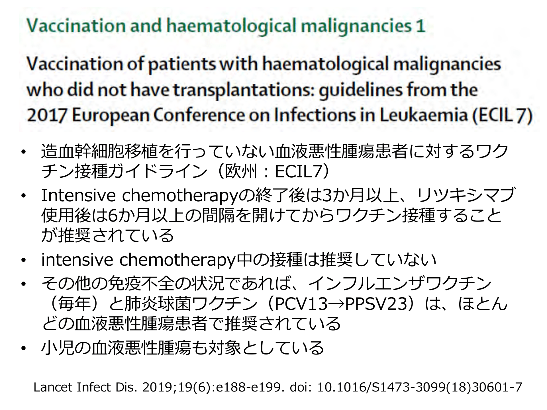 #148. • 造血幹細胞移植を行っていない血液悪性腫瘍患者に対するワク チン接種ガイドライン(欧州:ECIL7) • Intensive chemotherapyの終了後は3か月以上、リツキシマブ 使用後は6か月以上の間隔を開けてからワクチン接種すること が推奨されている • intensive chemotherapy中の接種は推奨していない • その他の免疫不全の状況であれば、インフルエンザワクチン (毎年)と肺炎球菌ワクチン(PCV13→PPSV23)は、ほとん どの血液悪性腫瘍患者で推奨されている • 小児の血液悪性腫瘍も対象としている Lancet Infect Dis. 2019;19(6):e188-e199. doi: 10.1016/S1473-3099(18)30601-7