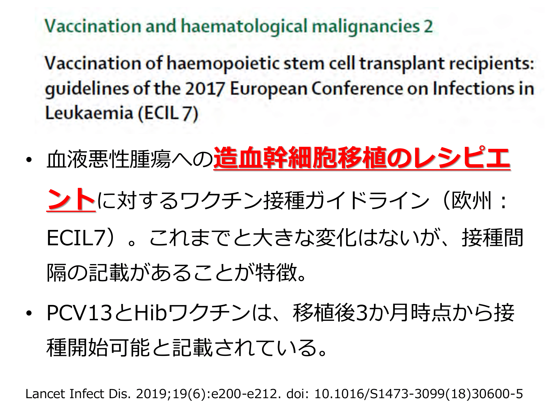 #149. • 血液悪性腫瘍への造血幹細胞移植のレシピエ ントに対するワクチン接種ガイドライン(欧州: ECIL7)。これまでと大きな変化はないが、接種間 隔の記載があることが特徴。 • PCV13とHibワクチンは、移植後3か月時点から接 種開始可能と記載されている。 Lancet Infect Dis. 2019;19(6):e200-e212. doi: 10.1016/S1473-3099(18)30600-5