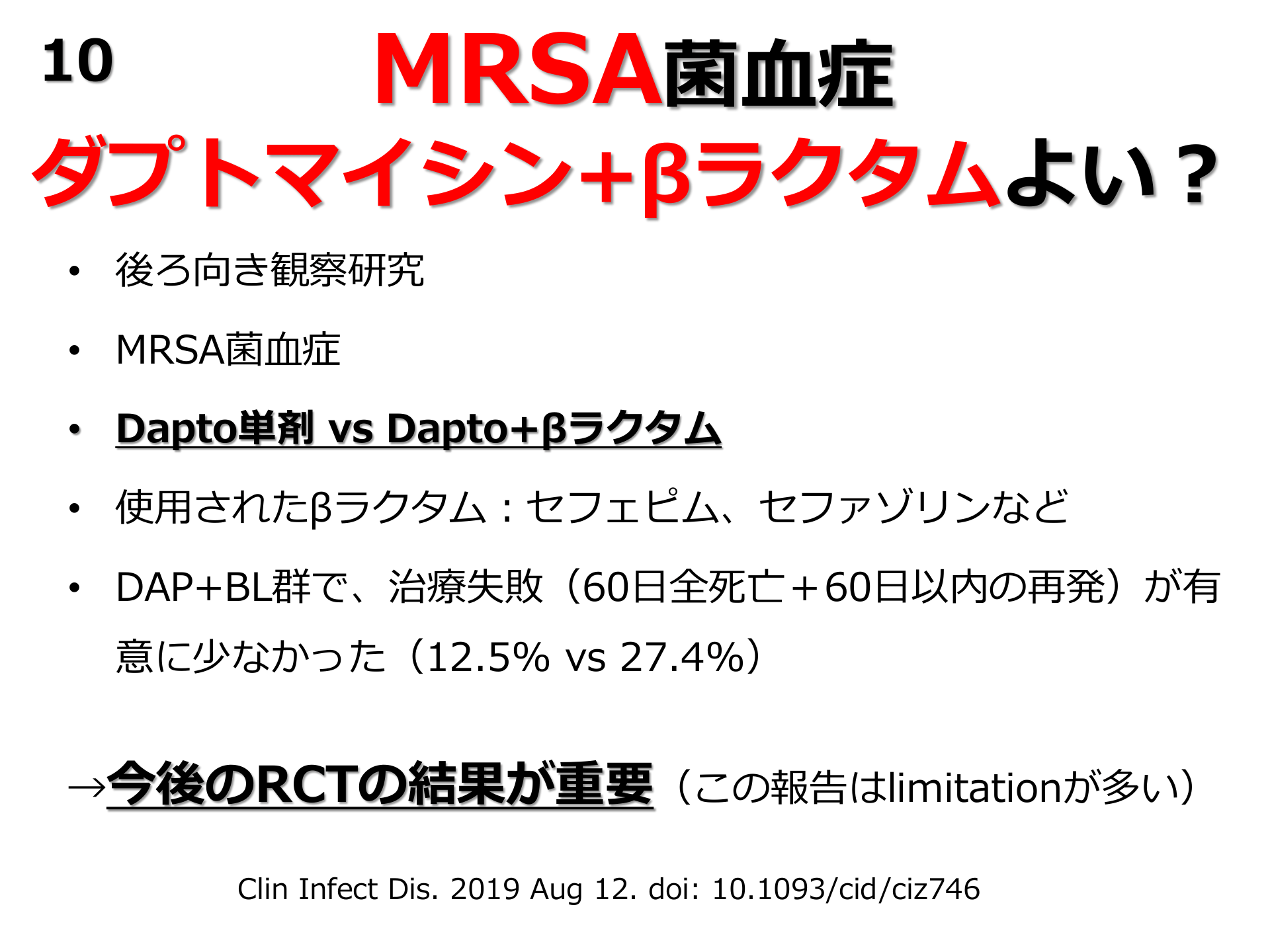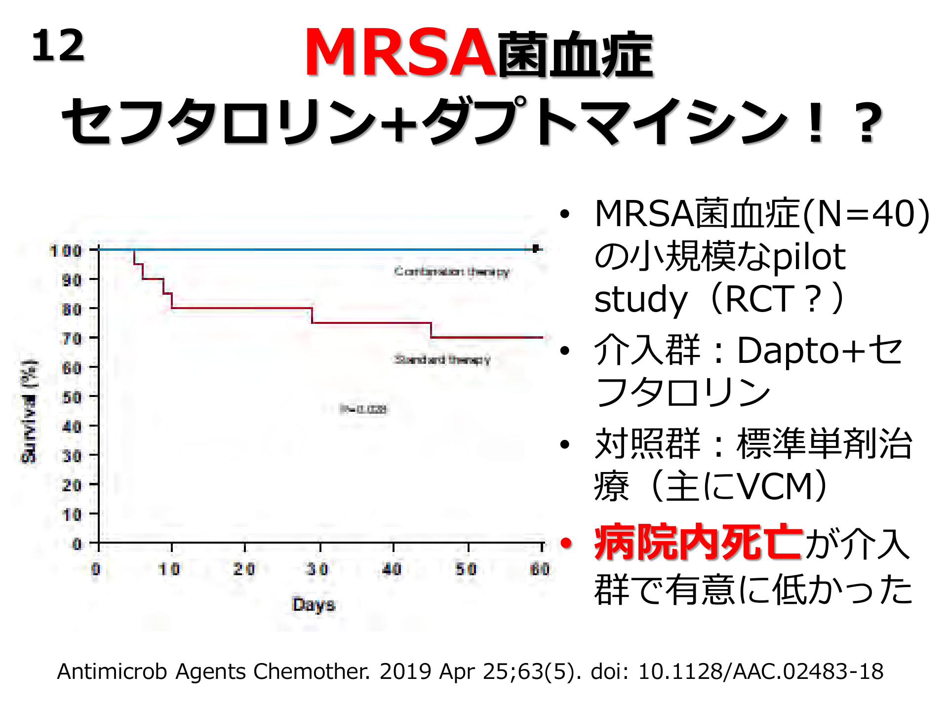 #17. 12 MRSA菌血症 セフタロリン+ダプトマイシン!? • MRSA菌血症(N=40) の小規模なpilot study(RCT?) • 介入群:Dapto+セ フタロリン • 対照群:標準単剤治 療(主にVCM) • 病院内死亡が介入 群で有意に低かった Antimicrob Agents Chemother. 2019 Apr 25;63(5). doi: 10.1128/AAC.02483-18